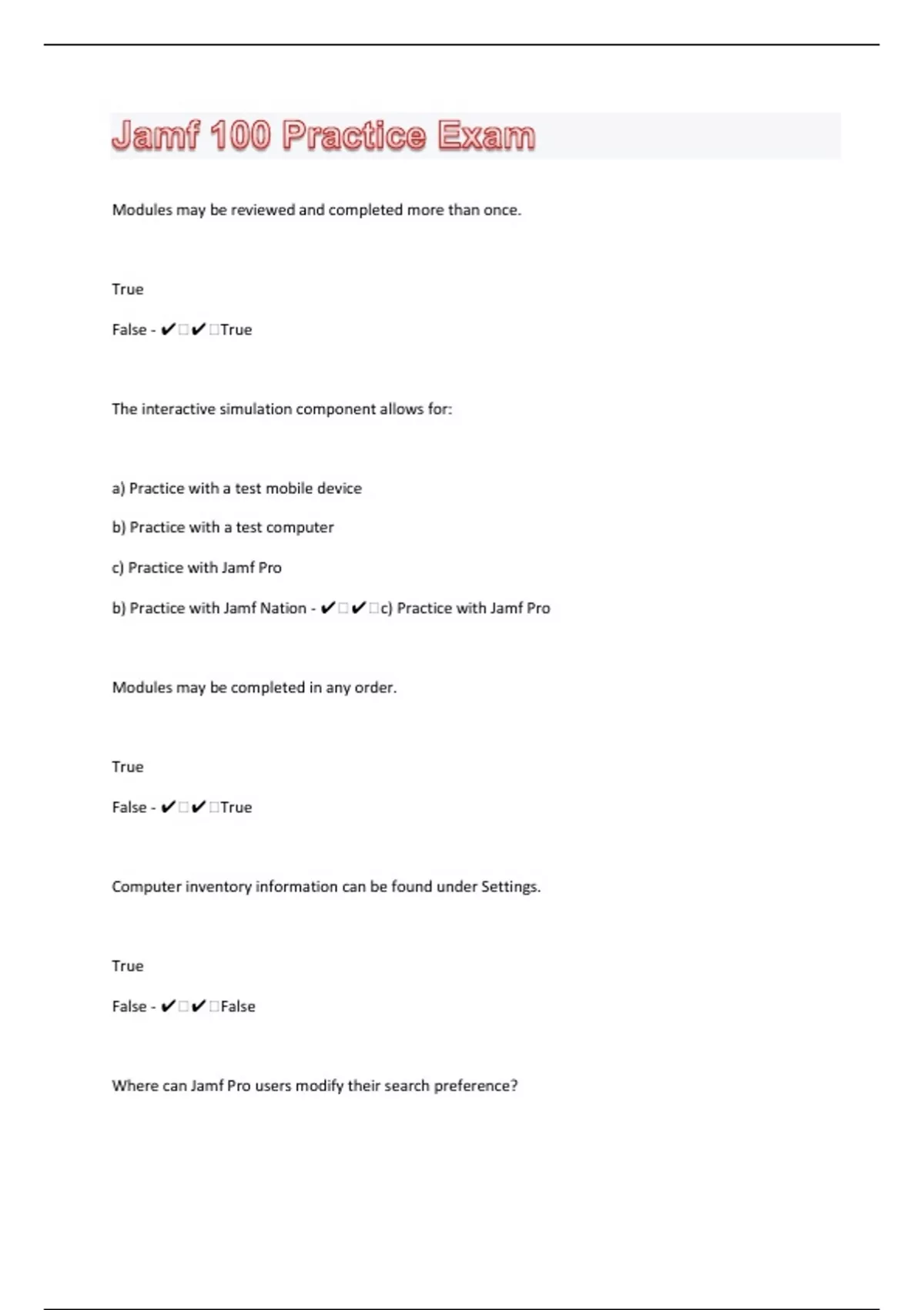 Modules may be reviewed and completed more than once. True False - ️️True The interactive simulation component allows for: a) Practice with a test mobile device b) Practice with a test computer c) Practice with Jamf Pro b) Practice with Jamf Nation - ️️c) Practice with Jamf Pro Modules may be completed in any order. True False - ️️True Computer inventory information can be found under Settings. True False - ️️False