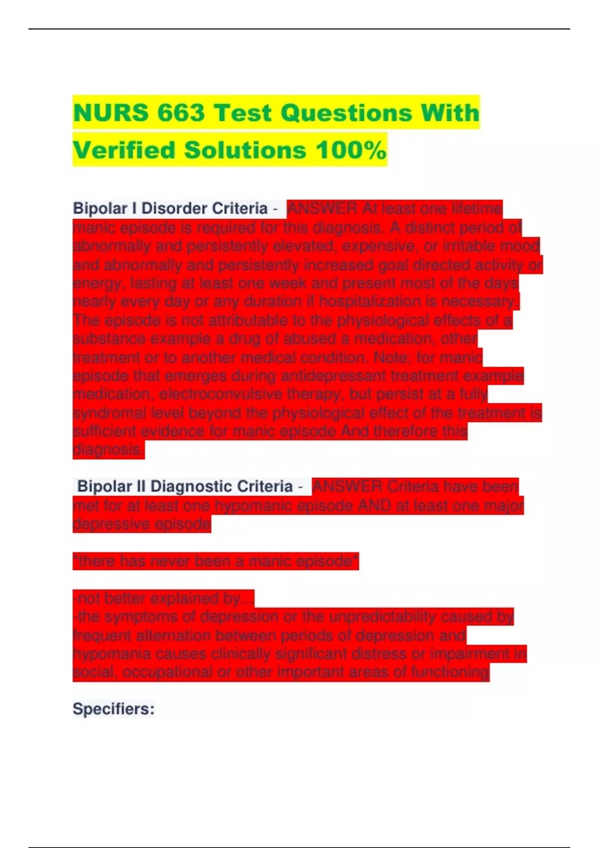 NURS 663 Test Questions With Verified Solutions 100% Bipolar I Disorder Criteria - ANSWER At least one lifetime manic episode is required for this diagnosis. A distinct period of abnormally and persistently elevated, expensive, or irritable mood and abnormally and persistently increased goal directed activity or energy, lasting at least one week and present most of the days nearly every day or any duration if hospitalization is necessary. The episode is not attributable to the physiological effects of a substance example a drug of abused a medication, other treatment or to another medical condition. Note; for manic episode that emerges during antidepressant treatment example medication, electroconvulsive therapy, but persist at a fully syndromal level beyond the physiological effect of the treatment is sufficient evidence for manic episode And therefore this diagnosis. Bipolar II Diagnostic Criteria - ANSWER Criteria have been met for at least one hypomanic episode AND at least one major depressive episode *there has never been a manic episode* -not better explained by... -the symptoms of depression or the unpredictability caused by frequent alternation between periods of depression and hypomania causes clinically significant distress or impairment in social, occupational or other important areas of functioning Specifiers: -with anxious distress -with mixed features -with rapid cycling (at least 4 mood episodes in past 12 months) -with melancholic features -with atypical features -with mood-congruent psychotic features -with mood-incongruent psychotic features -with catatonia -with peripartum onset -with seasonal pattern *Note* difference between cyclothymia and bipolar II -bipolar II has ONE OR MORE MAJOR DEPRESSIVE EPISODES -if major depressive episode occurs after the first 2 years of cyclothymic disorder, the additional diagnosis of bipolar II is given cyclothymic disorder - ANSWER This diagnosis is given to adults who experience at least two years or for children one year of both hypo manic and depressive periods without fulfilling the criteria for an episode of mania, hypo mania, or major depression. Bipolar I disorder - ANSWER must meet criteria for a manic episode. A distinct period of abnormally and persistently elevated, expansive, or irritable mood and abnormally and persistently increased goal directed activity or energy lasting at least one week. During the mood disturbance three other symptoms must be present, or four if the mood is only irritable. Bipolar I disorder symptoms - ANSWER Manic symptoms along with: Increased self-esteem or grandiosity Decrease need for sleep; feels rested after only three hours. More talkative than usual or pressure to keep talking Flights of ideas or subjective experience that thoughts are racing. Distractibility; attention too easily drawn to unimportant or irrelevant external stimuli as reported or observed. Increased in goal directed activity; either socially, at work or school or sexually or psycho motor agitation; purposeless nongoal directed activity. Excessive involvement in activities that have a high potential for painful consequences such as, engaging in unrestrained buying spree's, sexual indiscretion or foolish business investments. Marked mood disturbance with impairment in social or occupational functioning. Hospitalization due to their threat to hurt self or others, or other psychotic features. The symptoms are not attributed to physiological effects of a substance, or other medical condition. Bipolar II Disorder - ANSWER For diagnosis of this disorder it is necessary to meet the following criteria for a current or past hypo manic episode and the following criteria for occurring or past depressive episode. Hypo manic episode criteria - ANSWER A. A distinct. Of abnormally or persistently elevated, expansive, or irritable mood and abnormally and persistently increased activity or energy, lasting at least four consecutive days and present most of the day, nearly every day. Be. During the period of mood disturbance and increase energy and activity, three or more of the following symptoms have persisted for if the mood is only irritable. 1. Inflated self-esteem or grandiosity 2. Decreased need for sleep; feels rested after only three hours of sleep 3. More talkative than usual or pressure to keep talking. 4. Flight of ideas or subjective experience that thoughts are racing. 5. Distractibility; attention too easily drawn to unimportant or irrelevant external stimuli, as reported or observed.