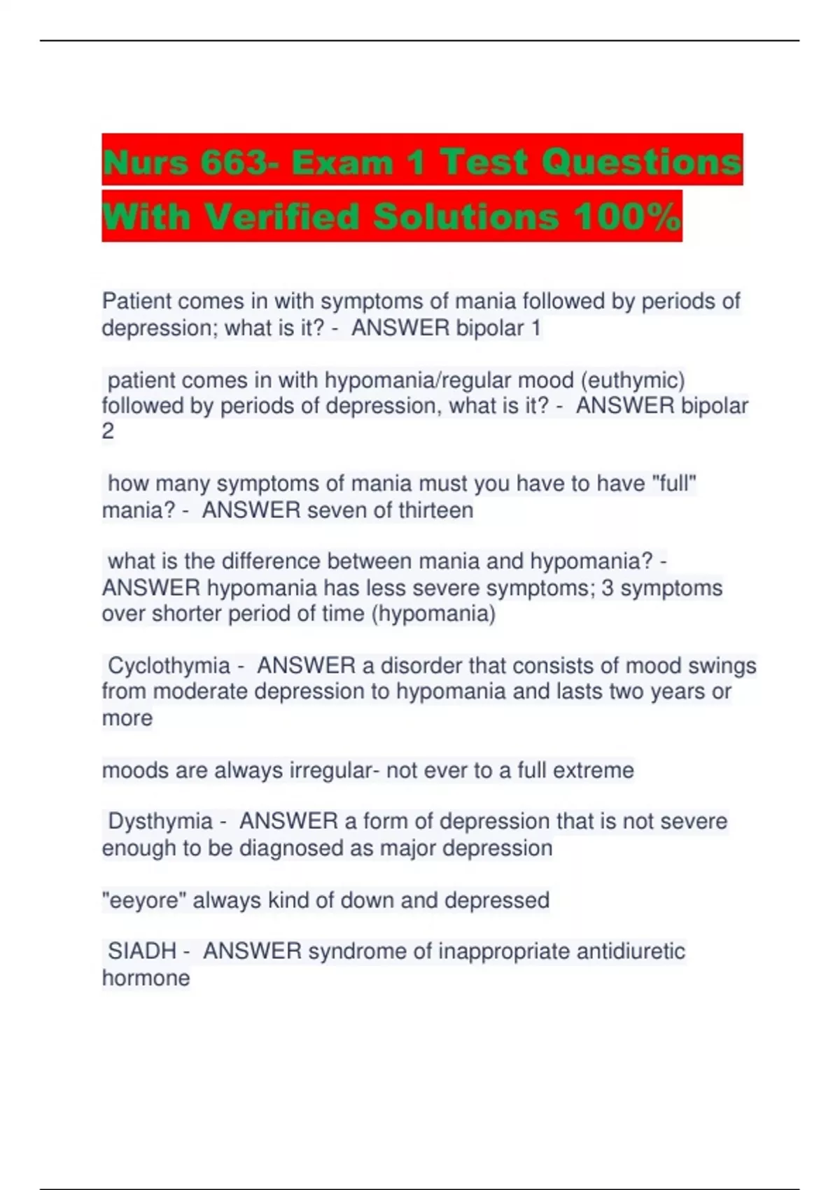 Nurs 663- Exam 1 Test Questions With Verified Solutions 100% Patient comes in with symptoms of mania followed by periods of depression; what is it? - ANSWER bipolar 1 patient comes in with hypomania/regular mood (euthymic) followed by periods of depression, what is it? - ANSWER bipolar 2 how many symptoms of mania must you have to have "full" mania? - ANSWER seven of thirteen what is the difference between mania and hypomania? - ANSWER hypomania has less severe symptoms; 3 symptoms over shorter period of time (hypomania) Cyclothymia - ANSWER a disorder that consists of mood swings from moderate depression to hypomania and lasts two years or more moods are always irregular- not ever to a full extreme Dysthymia - ANSWER a form of depression that is not severe enough to be diagnosed as major depression "eeyore" always kind of down and depressed SIADH - ANSWER syndrome of inappropriate antidiuretic hormone will retain water hyponatremia will be observed what is something you should watch out for if a patient is on multiple antidepressants? - ANSWER SIADH what medical problems mimic mood disorders? - ANSWER hypothyroid- depression hyperthyroid- mania involuntary admission - ANSWER hurt yourself hurt someone else inability to care for self Carbamazepine (Tegretol) - ANSWER mood stabilizer indication: bipolar disorder major side effects: CYP 450: (inducer- speeds up metabolism of other drugs) patient education: what 3 medications must have blood draws associated with them? - ANSWER carbamazepine, lithium, valproic acid Mood Disorder Questionnaire - ANSWER Screens for Bipolar Disorder 7+ is a positive screening 4-5 might be hypomania how is the PHQ-9 scored - ANSWER 1-4 minimal depression 5-9 mild depression 10-14 moderate depression 15-19 moderately severe 20 + severe PHQ-9 - ANSWER assessment that evaluates the degree of depression What is the DSM criteria for Major Depressive Disorder? - ANSWER **no history of mania, hypo, or mixed symptoms symptoms >2 weeks must have: sadness, anhedonia (loss pleasure/interest) 4 of following: - appetite/sleep changes, psychomotor retardation, lack of energy, guilt/worthlessness, issues w/ concentration, thoughts suicide/death What are the "frequency" modifiers for MDD? - ANSWER episodic: symptoms dissipate over time recurrent: likely to reappear in future subclinical: sadness + 3 symptoms > 10 days (full criteria not met) how is the severity of depression rated? - ANSWER - Mild: no suicidal thoughts/death wishes - Moderate: some thoughts of death/self-harm - Severe: plan/attempted