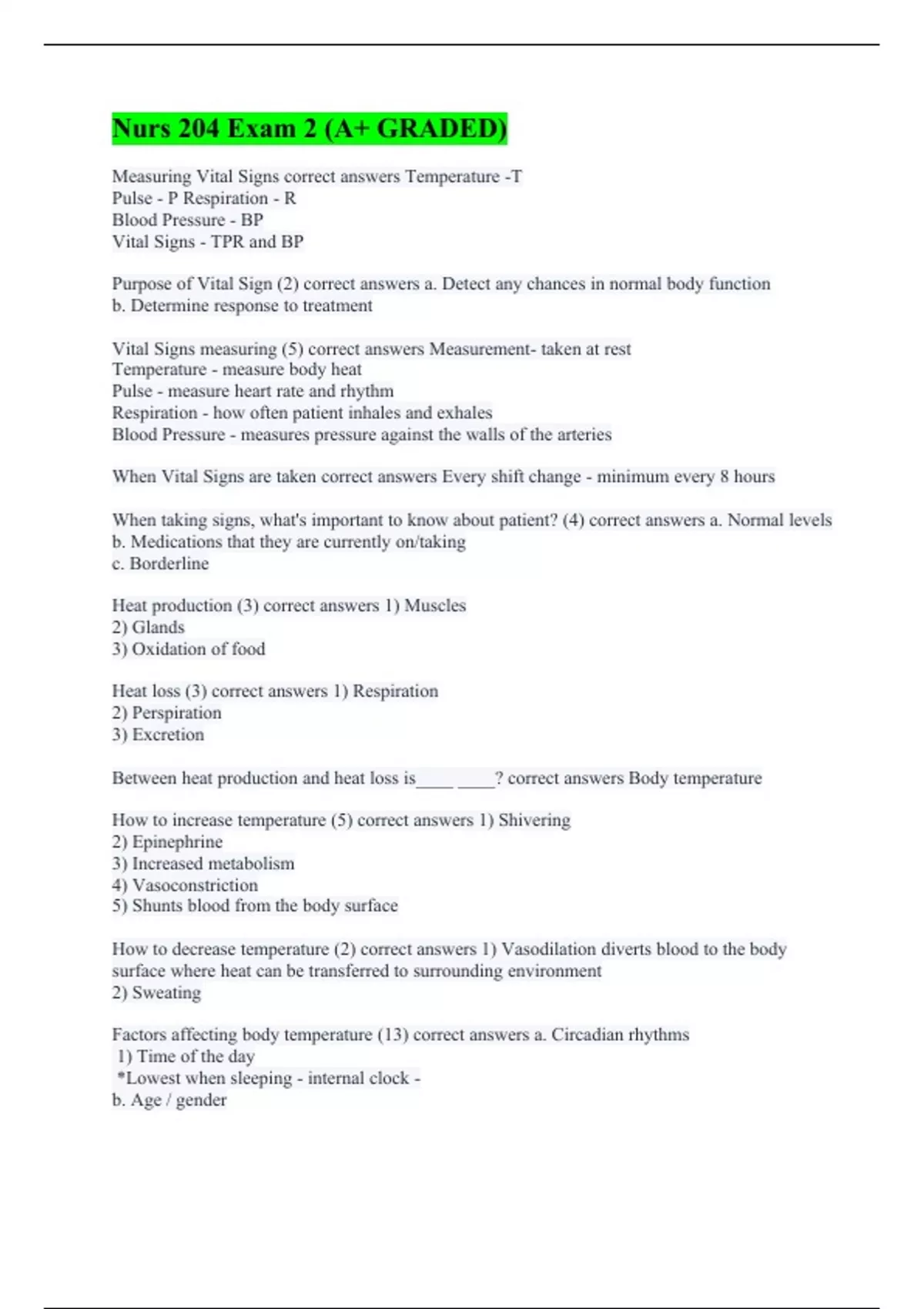 Measuring Vital Signs correct answers Temperature -T Pulse - P Respiration - R Blood Pressure - BP Vital Signs - TPR and BP Purpose of Vital Sign (2) correct answers a. Detect any chances in normal body function b. Determine response to treatment Vital Signs measuring (5) correct answers Measurement- taken at rest Temperature - measure body heat Pulse - measure heart rate and rhythm Respiration - how often patient inhales and exhales Blood Pressure - measures pressure against the walls of the arteries When Vital Signs are taken correct answers Every shift change - minimum every 8 hours When taking signs, what's important to know about patient? (4) correct answers a. Normal levels b. Medications that they are currently on/taking c. Borderline Heat production (3) correct answers 1) Muscles 2) Glands 3) Oxidation of food Heat loss (3) correct answers 1) Respiration 2) Perspiration 3) Excretion Between heat production and heat loss is____ ____? correct answers Body temperature How to increase temperature (5) correct answers 1) Shivering 2) Epinephrine 3) Increased metabolism 4) Vasoconstriction 5) Shunts blood from the body surface How to decrease temperature (2) correct answers 1) Vasodilation diverts blood to the body surface where heat can be transferred to surrounding environment 2) Sweating Factors affecting body temperature (13) correct answers a. Circadian rhythms 1) Time of the day *Lowest when sleeping - internal clock - b. Age / gender