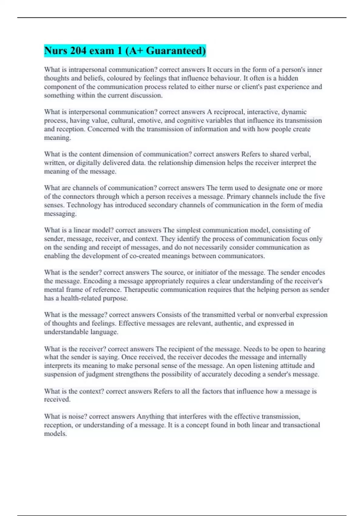 What is intrapersonal communication? correct answers It occurs in the form of a person's inner thoughts and beliefs, coloured by feelings that influence behaviour. It often is a hidden component of the communication process related to either nurse or client's past experience and something within the current discussion. What is interpersonal communication? correct answers A reciprocal, interactive, dynamic process, having value, cultural, emotive, and cognitive variables that influence its transmission and reception. Concerned with the transmission of information and with how people create meaning. What is the content dimension of communication? correct answers Refers to shared verbal, written, or digitally delivered data. the relationship dimension helps the receiver interpret the meaning of the message. What are channels of communication? correct answers The term used to designate one or more of the connectors through which a person receives a message. Primary channels include the five senses. Technology has introduced secondary channels of communication in the form of media messaging. What is a linear model? correct answers The simplest communication model, consisting of sender, message, receiver, and context. They identify the process of communication focus only on the sending and receipt of messages, and do not necessarily consider communication as enabling the development of co-created meanings between communicators. What is the sender? correct answers The source, or initiator of the message. The sender encodes the message. Encoding a message appropriately requires a clear understanding of the receiver's mental frame of reference. Therapeutic communication requires that the helping person as sender has a health-related purpose. What is the message? correct answers Consists of the transmitted verbal or nonverbal expression of thoughts and feelings. Effective messages are relevant, authentic, and expressed in understandable language. What is the receiver? correct answers The recipient of the message. Needs to be open to hearing what the sender is saying. Once received, the receiver decodes the message and internally interprets its meaning to make personal sense of the message. An open listening attitude and suspension of judgment strengthens the possibility of accurately decoding a sender's message. What is the context? correct answers Refers to all the factors that influence how a message is received. What is noise? correct answers Anything that interferes with the effective transmission, reception, or understanding of a message. It is a concept found in both linear and transactional models.