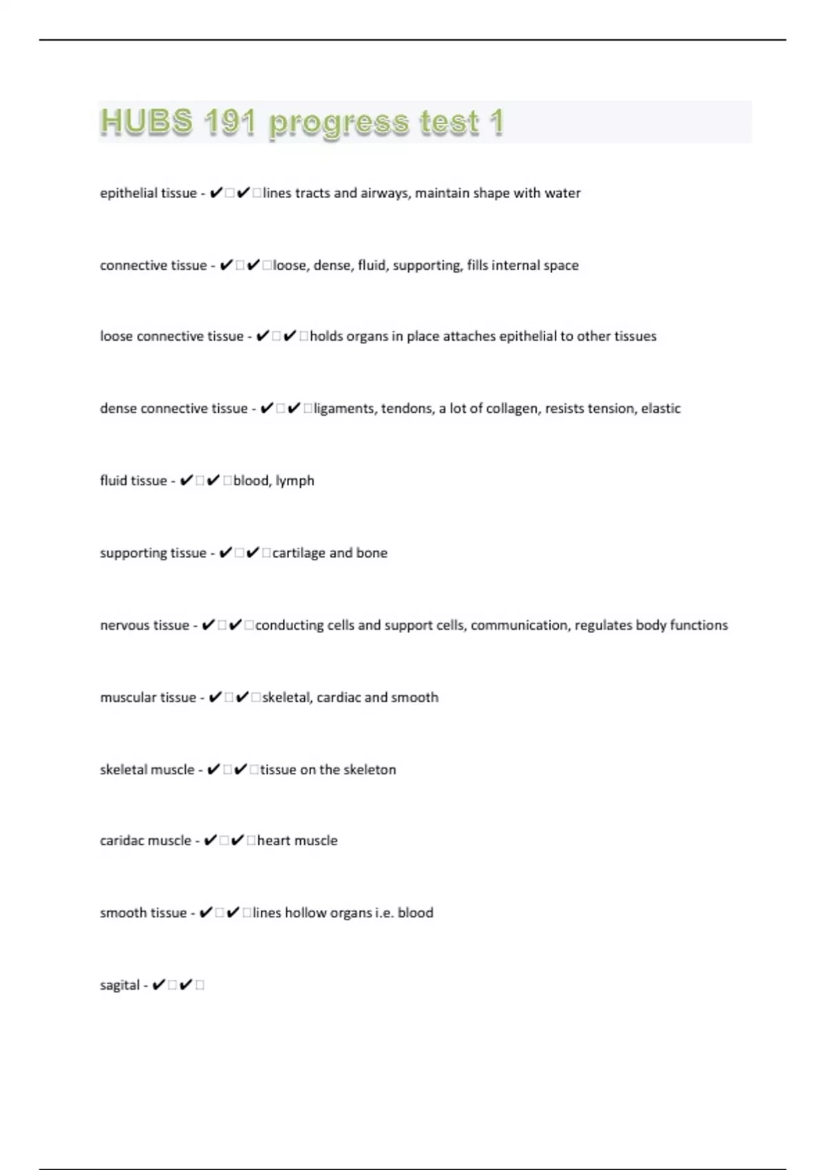 epithelial tissue - ️️lines tracts and airways, maintain shape with water connective tissue - ️️loose, dense, fluid, supporting, fills internal space loose connective tissue - ️️holds organs in place attaches epithelial to other tissues dense connective tissue - ️️ligaments, tendons, a lot of collagen, resists tension, elastic fluid tissue - ️️blood, lymph supporting tissue - ️️cartilage and bone nervous tissue - ️️conducting cells and support cells, communication, regulates body functions muscular tissue - ️️skeletal, cardiac and smooth skeletal muscle - ️️tissue on the skeleton caridac muscle - ️️heart muscle smooth tissue - ️️lines hollow organs i.e. blood sagital - ️️