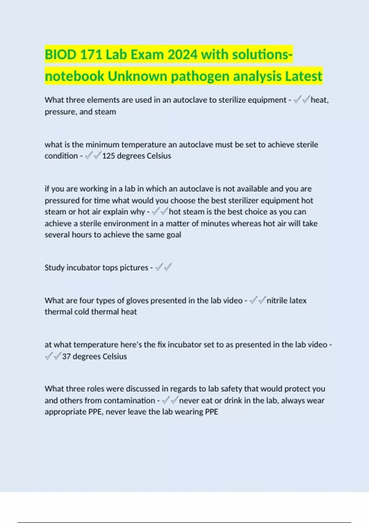 BIOD 171 Lab Exam 2024 with solutions- notebook Unknown pathogen analysis Latest What three elements are used in an autoclave to sterilize equipment - ️️heat, pressure, and steam what is the minimum temperature an autoclave must be set to achieve sterile condition - ️️125 degrees CelsiusBIOD 171 Lab Exam 2024 with solutions DOWNLOAD TO SECURE HIGHSCOREBIOD 171 Lab Exam 2024 with solutions DOWNLOAD TO SECURE HIGHSCOREBIOD 171 Lab Exam 2024 with solutions DOWNLOAD TO SECURE HIGHSCOREBIOD 171 Lab Exam 2024 with solutions DOWNLOAD TO SECURE HIGHSCOREBIOD 171 Lab Exam 2024 with solutions DOWNLOAD TO SECURE HIGHSCOREBIOD 171 Lab Exam 2024 with solutions DOWNLOAD TO SECURE HIGHSCOREBIOD 171 Lab Exam 2024 with solutions DOWNLOAD TO SECURE HIGHSCOREBIOD 171 Lab Exam 2024 with solutions DOWNLOAD TO SECURE HIGHSCOREBIOD 171 Lab Exam 2024 with solutions DOWNLOAD TO SECURE HIGHSCOREBIOD 171 Lab Exam 2024 with solutions DOWNLOAD TO SECURE HIGHSCOREBIOD 171 Lab Exam 2024 with solutions DOWNLOAD TO SECURE HIGHSCOREBIOD 171 Lab Exam 2024 with solutions DOWNLOAD TO SECURE HIGHSCOREBIOD 171 Lab Exam 2024 with solutions DOWNLOAD TO SECURE HIGHSCOREBIOD 171 Lab Exam 2024 with solutions DOWNLOAD TO SECURE HIGHSCOREBIOD 171 Lab Exam 2024 with solutions DOWNLOAD TO SECURE HIGHSCOREBIOD 171 Lab Exam 2024 with solutions DOWNLOAD TO SECURE HIGHSCOREBIOD 171 Lab Exam 2024 with solutions DOWNLOAD TO SECURE HIGHSCOREBIOD 171 Lab Exam 2024 with solutions DOWNLOAD TO SECURE HIGHSCOREBIOD 171 Lab Exam 2024 with solutions DOWNLOAD TO SECURE HIGHSCOREBIOD 171 Lab Exam 2024 with solutions DOWNLOAD TO SECURE HIGHSCOREBIOD 171 Lab Exam 2024 with solutions DOWNLOAD TO SECURE HIGHSCOREBIOD 171 Lab Exam 2024 with solutions DOWNLOAD TO SECURE HIGHSCOREBIOD 171 Lab Exam 2024 with solutions DOWNLOAD TO SECURE HIGHSCOREBIOD 171 Lab Exam 2024 with solutions DOWNLOAD TO SECURE HIGHSCOREBIOD 171 Lab Exam 2024 with solutions DOWNLOAD TO SECURE HIGHSCOREBIOD 171 Lab Exam 2024 with solutions DOWNLOAD TO SECURE HIGHSCOREBIOD 171 Lab Exam 2024 with solutions DOWNLOAD TO SECURE HIGHSCOREBIOD 171 Lab Exam 2024 with solutions DOWNLOAD TO SECURE HIGHSCOREBIOD 171 Lab Exam 2024 with solutions DOWNLOAD TO SECURE HIGHSCOREBIOD 171 Lab Exam 2024 with solutions DOWNLOAD TO SECURE HIGHSCOREBIOD 171 Lab Exam 2024 with solutions DOWNLOAD TO SECURE HIGHSCOREBIOD 171 Lab Exam 2024 with solutions DOWNLOAD TO SECURE HIGHSCOREBIOD 171 Lab Exam 2024 with solutions DOWNLOAD TO SECURE HIGHSCOREBIOD 171 Lab Exam 2024 with solutions DOWNLOAD TO SECURE HIGHSCOREBIOD 171 Lab Exam 2024 with solutions DOWNLOAD TO SECURE HIGHSCOREBIOD 171 Lab Exam 2024 with solutions DOWNLOAD TO SECURE HIGHSCOREBIOD 171 Lab Exam 2024 with solutions DOWNLOAD TO SECURE HIGHSCOREBIOD 171 Lab Exam 2024 with solutions DOWNLOAD TO SECURE HIGHSCOREBIOD 171 Lab Exam 2024 with solutions DOWNLOAD TO SECURE HIGHSCOREBIOD 171 Lab Exam 2024 with solutions DOWNLOAD TO SECURE HIGHSCOREBIOD 171 Lab Exam 2024 with solutions DOWNLOAD TO SECURE HIGHSCOREBIOD 171 Lab Exam 2024 with solutions DOWNLOAD TO SECURE HIGHSCOREBIOD 171 Lab Exam 2024 with solutions DOWNLOAD TO SECURE HIGHSCOREBIOD 171 Lab Exam 2024 with solutions DOWNLOAD TO SECURE HIGHSCOREBIOD 171 Lab Exam 2024 with solutions DOWNLOAD TO SECURE HIGHSCORE