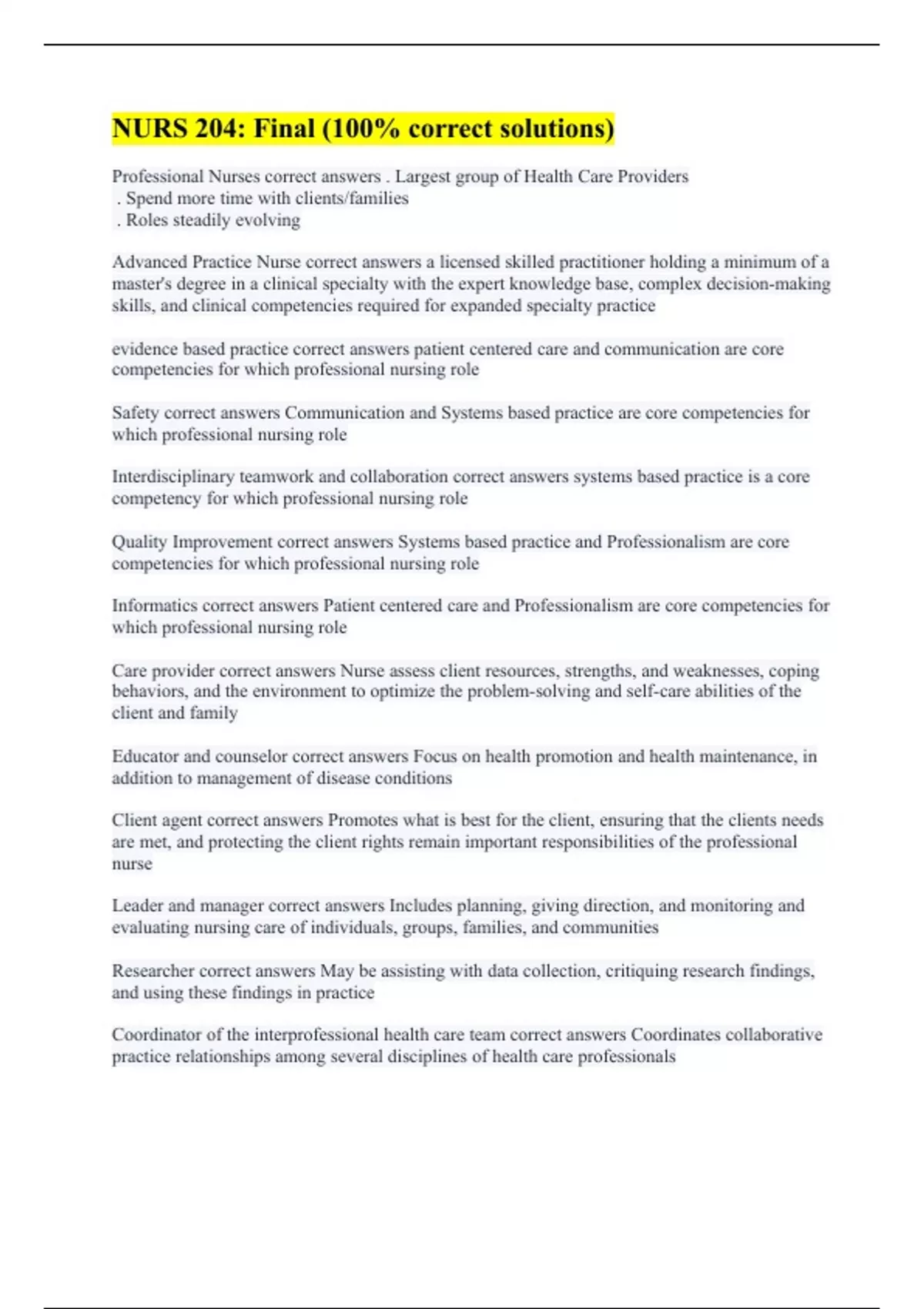 Professional Nurses correct answers . Largest group of Health Care Providers . Spend more time with clients/families . Roles steadily evolving Advanced Practice Nurse correct answers a licensed skilled practitioner holding a minimum of a master's degree in a clinical specialty with the expert knowledge base, complex decision-making skills, and clinical competencies required for expanded specialty practice evidence based practice correct answers patient centered care and communication are core competencies for which professional nursing role Safety correct answers Communication and Systems based practice are core competencies for which professional nursing role Interdisciplinary teamwork and collaboration correct answers systems based practice is a core competency for which professional nursing role Quality Improvement correct answers Systems based practice and Professionalism are core competencies for which professional nursing role Informatics correct answers Patient centered care and Professionalism are core competencies for which professional nursing role Care provider correct answers Nurse assess client resources, strengths, and weaknesses, coping behaviors, and the environment to optimize the problem-solving and self-care abilities of the client and family Educator and counselor correct answers Focus on health promotion and health maintenance, in addition to management of disease conditions Client agent correct answers Promotes what is best for the client, ensuring that the clients needs are met, and protecting the client rights remain important responsibilities of the professional nurse Leader and manager correct answers Includes planning, giving direction, and monitoring and evaluating nursing care of individuals, groups, families, and communities Researcher correct answers May be assisting with data collection, critiquing research findings, and using these findings in practice Coordinator of the interprofessional health care team correct answers Coordinates collaborative practice relationships among several disciplines of health care professionals
