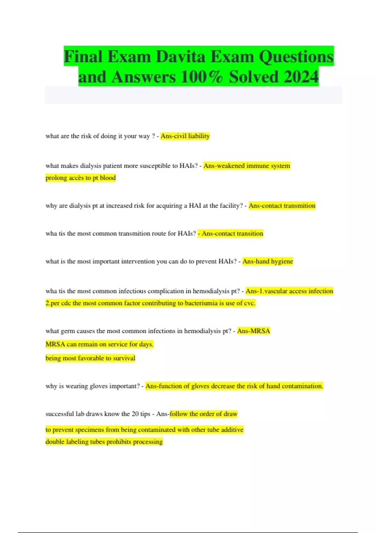 Final Exam Davita Exam Questions and Answers 100% Solved 2024 what are the risk of doing it your way ? - Ans-civil liability what makes dialysis patient more susceptible to HAIs? - Ans-weakened immune system prolong accès to pt blood why are dialysis pt at increased risk for acquiring a HAI at the facility? - Ans-contact transmition wha tis the most common transmition route for HAIs? - Ans-contact transition what is the most important intervention you can do to prevent HAIs? - Ans-hand hygiene wha tis the most common infectious complication in hemodialysis pt? - Alar access infection cdc the most common factor contributing to bacteriumia is use of cvc. what germ causes the most common infections in hemodialysis pt? - Ans-MRSA MRSA can remain on service for days. being most favorable to survival why is wearing gloves important? - Ans-function of gloves decrease the risk of hand contamination. successful lab draws know the 20 tips - Ans-follow the order of draw to prevent specimens from being contaminated with other tube additive double labeling tubes prohibits processing what is rule of spinning samples? - Ans-balance, spin tubes of same kind size fill level and should be placed opposite of each other. what are signs and symptoms of hyperkalemia - Ans-high potassuim-muscle weakness, abnormal heart rate what are signs and symptoms of hypokalemia - Ans-low potassium-muscle cramp abnormal heart rate cold how can you prevent contributing to blood loss? - Ate heparinzation