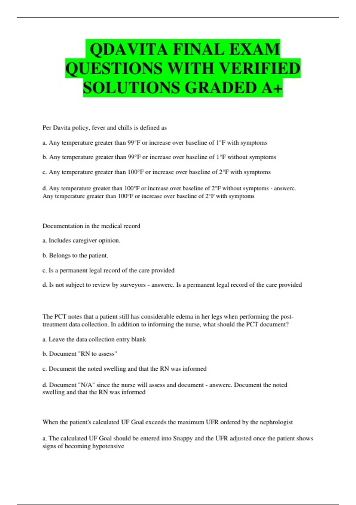 QDAVITA FINAL EXAM QUESTIONS WITH VERIFIED SOLUTIONS GRADED A+ Per Davita policy, fever and chills is defined as a. Any temperature greater than 99°F or increase over baseline of 1°F with symptoms b. Any temperature greater than 99°F or increase over baseline of 1°F without symptoms c. Any temperature greater than 100°F or increase over baseline of 2°F with symptoms d. Any temperature greater than 100°F or increase over baseline of 2°F without symptoms - answerc. Any temperature greater than 100°F or increase over baseline of 2°F with symptoms Documentation in the medical record a. Includes caregiver opinion. b. Belongs to the patient. c. Is a permanent legal record of the care provided d. Is not subject to review by surveyors - answerc. Is a permanent legal record of the care provided The PCT notes that a patient still has considerable edema in her legs when performing the posttreatment data collection. In addition to informing the nurse, what should the PCT document? a. Leave the data collection entry blank b. Document "RN to assess" c. Document the noted swelling and that the RN was informed d. Document "N/A" since the nurse will assess and document - answerc. Document the noted swelling and that the RN was informed When the patient's calculated UF Goal exceeds the maximum UFR ordered by the nephrologist a. The calculated UF Goal should be entered into Snappy and the UFR adjusted once the patient shows signs of becoming hypotensive