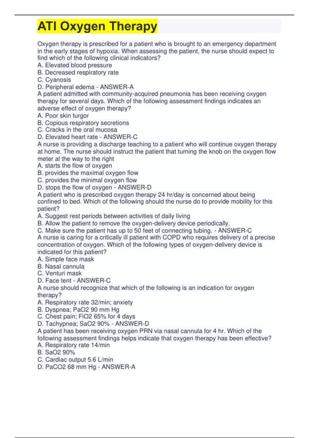 ATI Oxygen Therapy Oxygen therapy is prescribed for a patient who is brought to an emergency department in the early stages of hypoxia. When assessing the patient, the nurse should expect to find which of the following clinical indicators? A. Elevated blood pressure B. Decreased respiratory rate C. Cyanosis D. Peripheral edema - ANSWER-A A patient admitted with community-acquired pneumonia has been receiving oxygen therapy for several days. Which of the following assessment findings indicates an adverse effect of oxygen therapy? A. Poor skin turgor B. Copious respiratory secretions C. Cracks in the oral mucosa D. Elevated heart rate - ANSWER-C
