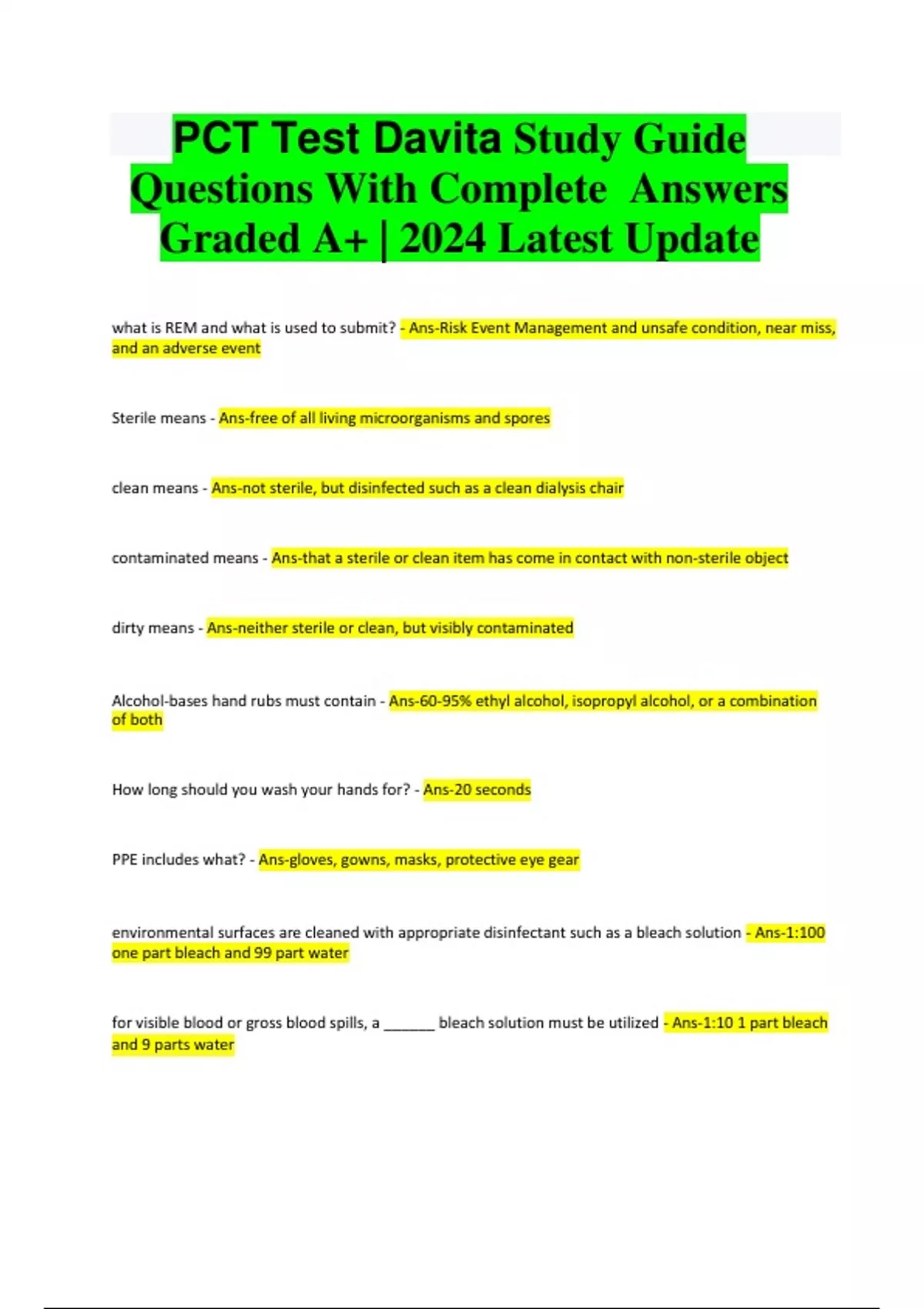 PCT Test Davita Study Guide Questions With Complete Answers Graded A+ | 2024 Latest Update what is REM and what is used to submit? - Ans-Risk Event Management and unsafe condition, near miss, and an adverse event Sterile means - Ans-free of all living microorganisms and spores clean means - Ans-not sterile, but disinfected such as a clean dialysis chair contaminated means - Ans-that a sterile or clean item has come in contact with non-sterile object dirty means - Ans-neither sterile or clean, but visibly contaminated Alcohol-bases hand rubs must contain - Ans-60-95% ethyl alcohol, isopropyl alcohol, or a combination of both How long should you wash your hands for? - Ans-20 seconds PPE includes what? - Ans-gloves, gowns, masks, protective eye gear environmental surfaces are cleaned with appropriate disinfectant such as a bleach solution - Ans-1:100 one part bleach and 99 part water for visible blood or gross blood spills, a ______ bleach solution must be utilized - Ans-1:10 1 part bleach and 9 parts water when preparing patient assignments, teammates who care for confirmed or suspected hep B surface antigen (HBsAg) positive patient(s) will only be assigned to simultaneously care for surface - Ansantibody positive (immune) patients