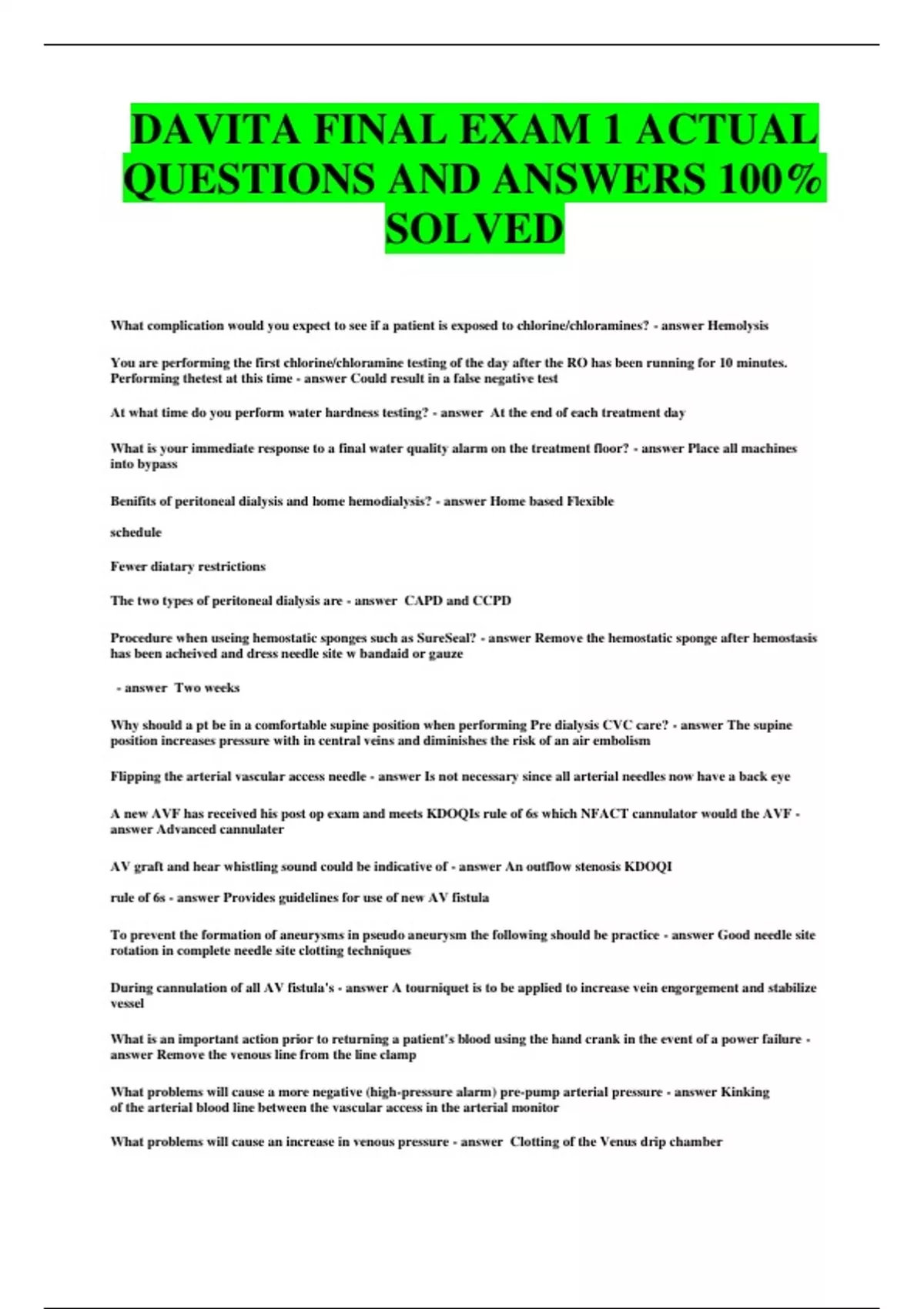 DAVITA FINAL EXAM 1 ACTUAL QUESTIONS AND ANSWERS 100% SOLVED What complication would you expect to see if a patient is exposed to chlorine/chloramines? - answer Hemolysis You are performing the first chlorine/chloramine testing of the day after the RO has been running for 10 minutes. Performing thetest at this time - answer Could result in a false negative test At what time do you perform water hardness testing? - answer At the end of each treatment day What is your immediate response to a final water quality alarm on the treatment floor? - answer Place all machines into bypass Benifits of peritoneal dialysis and home hemodialysis? - answer Home based Flexible schedule Fewer diatary restrictions The two types of peritoneal dialysis are - answer CAPD and CCPD Procedure when useing hemostatic sponges such as SureSeal? - answer Remove the hemostatic sponge after hemostasis has been acheived and dress needle site w bandaid or gauze - answer Two weeks Why should a pt be in a comfortable supine position when performing Pre dialysis CVC care? - answer The supine position increases pressure with in central veins and diminishes the risk of an air embolism