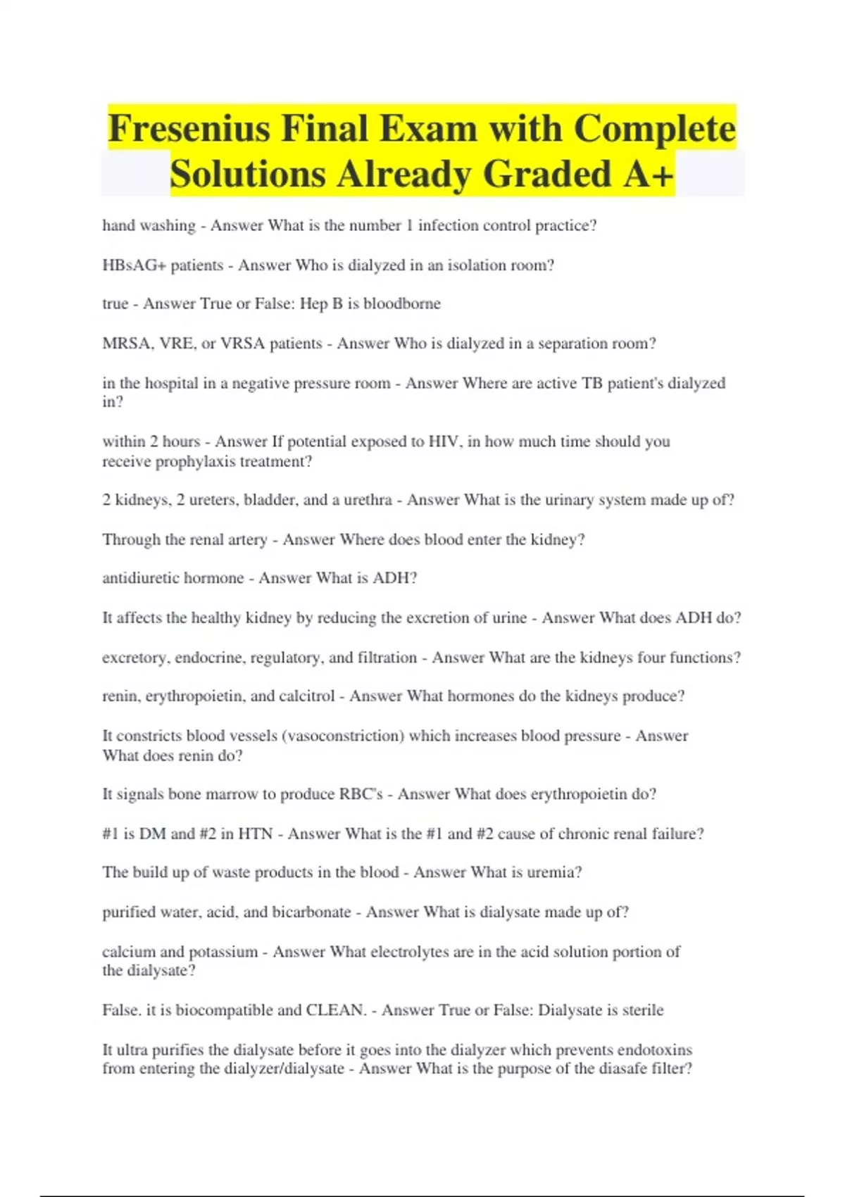 Fresenius Final Exam with Complete Solutions Already Graded A+ hand washing - Answer What is the number 1 infection control practice? HBsAG+ patients - Answer Who is dialyzed in an isolation room? true - Answer True or False: Hep B is bloodborne MRSA, VRE, or VRSA patients - Answer Who is dialyzed in a separation room? in the hospital in a negative pressure room - Answer Where are active TB patient's dialyzed in? within 2 hours - Answer If potential exposed to HIV, in how much time should you receive prophylaxis treatment? 2 kidneys, 2 ureters, bladder, and a urethra - Answer What is the urinary system made up of? Through the renal artery - Answer Where does blood enter the kidney? antidiuretic hormone - Answer What is ADH? It affects the healthy kidney by reducing the excretion of urine - Answer What does ADH do? excretory, endocrine, regulatory, and filtration - Answer What are the kidneys four functions? renin, erythropoietin, and calcitrol - Answer What hormones do the kidneys produce? It constricts blood vessels (vasoconstriction) which increases blood pressure - Answer What does renin do? It signals bone marrow to produce RBC's - Answer What does erythropoietin do? #1 is DM and #2 in HTN - Answer What is the #1 and #2 cause of chronic renal failure? The build up of waste products in the blood - Answer What is uremia? purified water, acid, and bicarbonate - Answer What is dialysate made up of? calcium and potassium - Answer What electrolytes are in the acid solution portion of the dialysate? False. it is biocompatible and CLEAN. - Answer True or False: Dialysate is sterile It ultra purifies the dialysate before it goes into the dialyzer which prevents endotoxins from entering the dialyzer/dialysate - Answer What is the purpose of the diasafe filter?