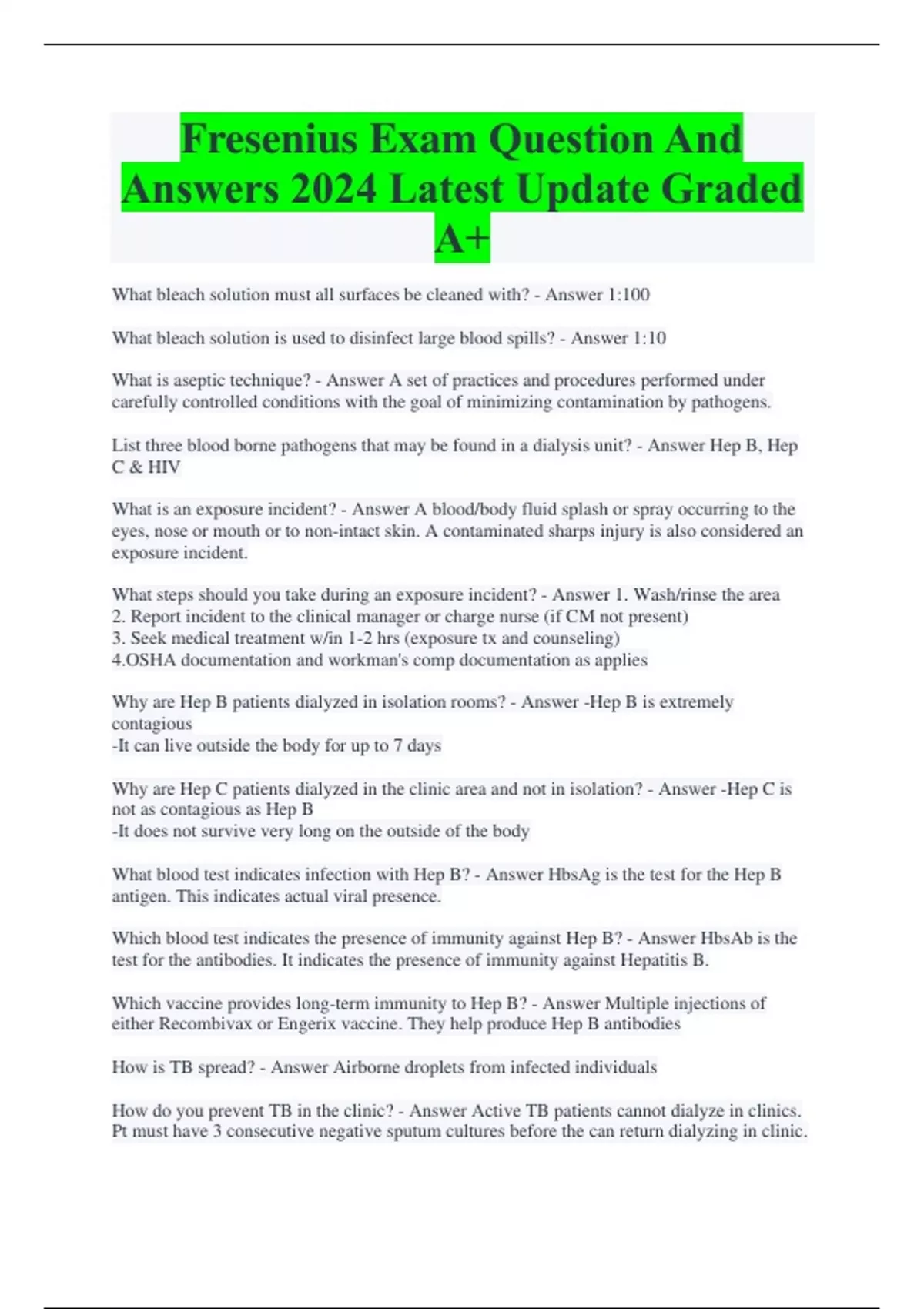 Fresenius Exam Question And Answers 2024 Latest Update Graded A+ What bleach solution must all surfaces be cleaned with? - Answer 1:100 What bleach solution is used to disinfect large blood spills? - Answer 1:10 What is aseptic technique? - Answer A set of practices and procedures performed under carefully controlled conditions with the goal of minimizing contamination by pathogens. List three blood borne pathogens that may be found in a dialysis unit? - Answer Hep B, Hep C & HIV What is an exposure incident? - Answer A blood/body fluid splash or spray occurring to the eyes, nose or mouth or to non-intact skin. A contaminated sharps injury is also considered an exposure incident. What steps should you take during an exposure incident? - Answer 1. Wash/rinse the area 2. Report incident to the clinical manager or charge nurse (if CM not present) 3. Seek medical treatment w/in 1-2 hrs (exposure tx and counseling) 4.OSHA documentation and workman's comp documentation as applies