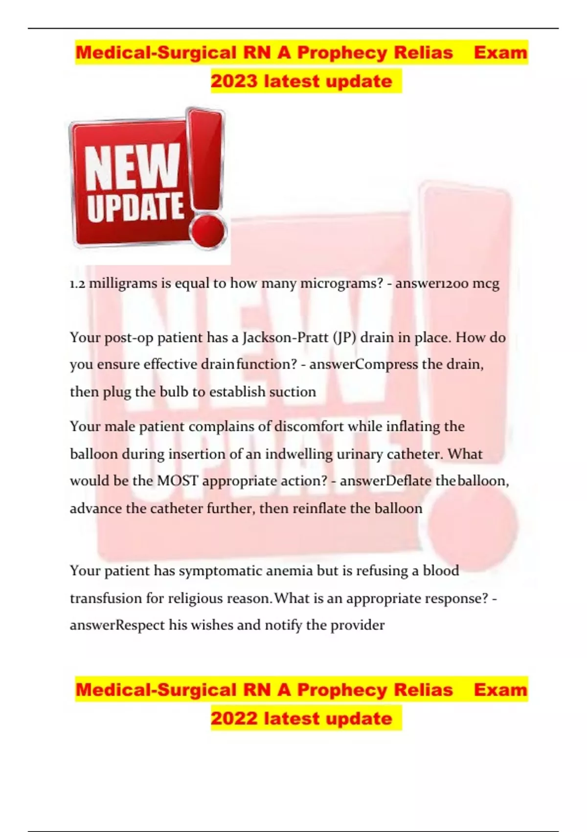 Medical-Surgical RN A Prophecy Relias Exam 2023 latest update Medical-Surgical RN A Prophecy Relias Exam 2022 latest update 1.2 milligrams is equal to how many micrograms? - answer1200 mcg Your post-op patient has a Jackson-Pratt (JP) drain in place. How do you ensure effective drainfunction? - answerCompress the drain, then plug the bulb to establish suction Your male patient complains of discomfort while inflating the balloon during insertion of an indwelling urinary catheter. What would be the MOST appropriate action? - answerDeflate theballoon, advance the catheter further, then reinflate the balloon Your patient has symptomatic anemia but is refusing a blood transfusion for religious reason.What is an appropriate response? - answerRespect his wishes and notify the provider Medical-Surgical RN A Prophecy Relias Exam 2023 latest update Medical-Surgical RN A Prophecy Relias Exam 2022 latest update Your patient is admitted with diverticulitis. What type of diet do you expect to be ordered for thepatient? - answerbroth, jello, soft fruit no skin, You were hired to work the medical unit and when you arrive at work the charge nurse has assigned you to the post-surgical unit since they are understaffed. Which is the MOST appropriateaction? - answerReport to the post-surgical unit. What is a proton pump inhibitor, such as pantoprazole (Protonix) used for? - answerAcidReduction Which adaptive equipment would be MOST appropriate to use for a severely contracted patientwho is unable to bear weight when transferring from the bed to the chair? - answerPatient lift (e.g., Hoyer) Which tool should you use to assess pain in you 80-year-old patient with severe dementia? -answerPAINAD scale Medical-Surgical RN A Prophecy Relias Exam 2023 latest update Medical-Surgical RN A Prophecy Relias Exam 2022 latest update