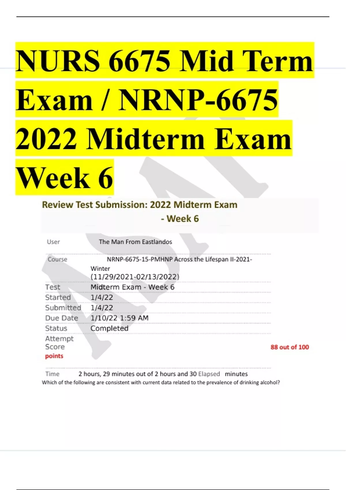 NURS 6675 Mid Term Exam / NRNP-6675 2022 Midterm Exam Week 6 Review Test Submission: 2022 Midterm Exam - Week 6 User The Man From Eastlandos Course NRNP-6675-15-PMHNP Across the Lifespan II-2021- Winter 88 out of 100 points Time 2 hours, 29 minutes out of 2 hours and 30 Elapsed minutes Which of the following are consistent with current data related to the prevalence of drinking alcohol? A Men and women with higher education and income are less likely to drink alcohol. . B Men and women with higher education and income are more likely to drink alcohol. . C Men and women with lower education and higher income are more likely to drink alcohol. . D Education and income are not a factor in prevalence of drinking alcohol. . Discrepancy between anatomical sex and gender identity is known as which of the following? A Gender role behavior . B Gender discordance . C Gender nonconformity . D Internalized sexual prejudice . The fear of social situations, including situations that involve scrutiny or contact with strangers is known as which of the following? A Specific phobia . B Social anxiety disorder . C Generalized anxiety disorder . D Avoidant personality disorder . Recurrent preoccupation with sexual urges and fantasies involving the act of being humiliated, beaten, bound, or otherwise made to suffer is known as which of the following? A Frotteurism . B Sexual Sadism . C Sexual Masochism* . D Other Specified Paraphilic Disorder . Which of the following is not consistent with the onset of OCD? A More than half of patients with OCD have a sudden onset of symptoms. . B The onset of symptoms for about 50 – 70 percent of patients occurs after a stressful event. . C Most patients keep their symptoms secret initially. . D The onset of OCD is typically preceded by OCD personality traits. . Which of the following neurotransmitters increases libido? A term used to designate the behavioral patterns of family members who have been significantly affected by another family member’s substance use or addiction is which of the following? Data indicate which of the following regarding women drinking while pregnant or breast feeding?