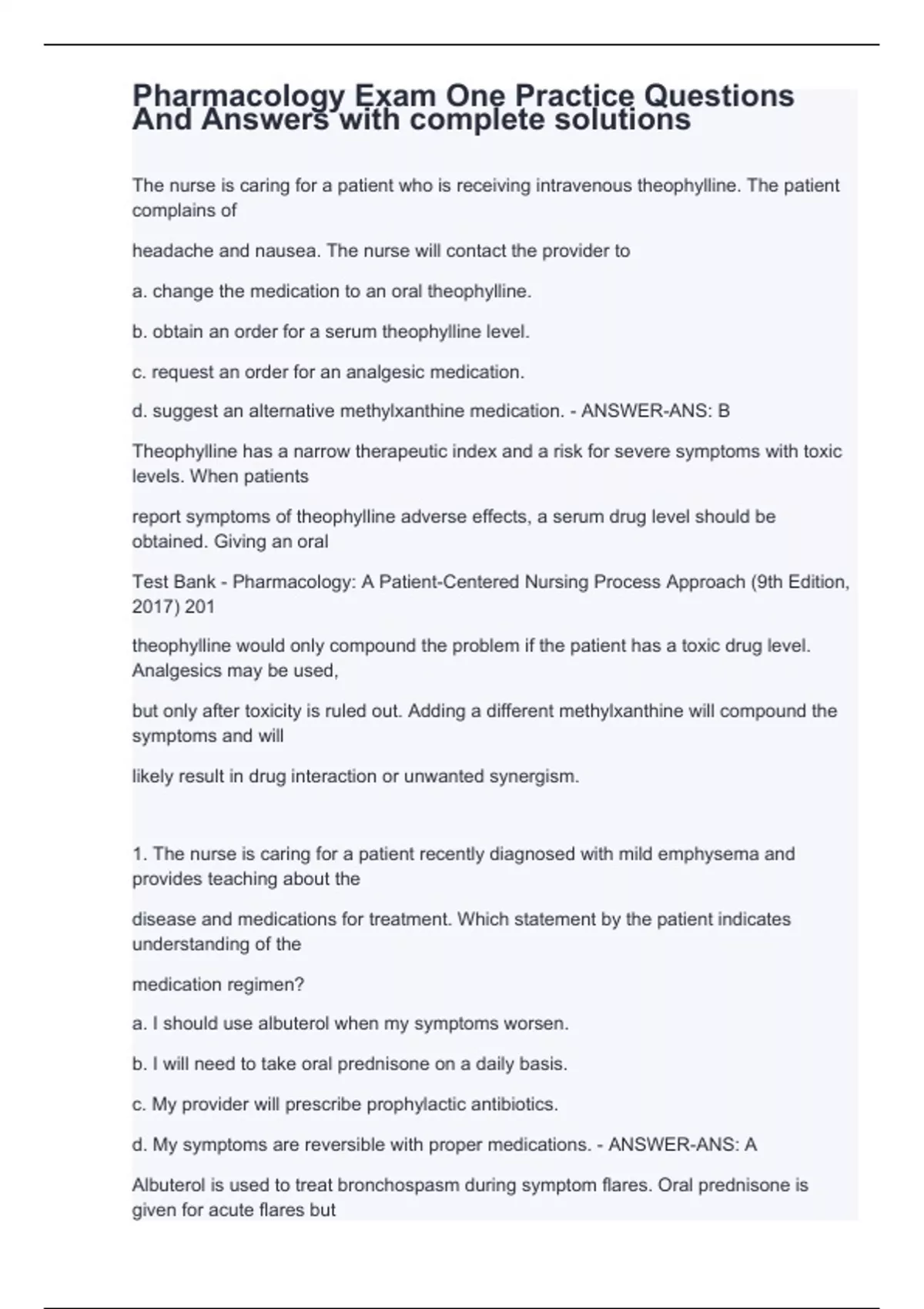 The nurse is caring for a patient who is receiving intravenous theophylline. The patient complains of headache and nausea. The nurse will contact the provider to a. change the medication to an oral theophylline. b. obtain an order for a serum theophylline level. c. request an order for an analgesic medication. d. suggest an alternative methylxanthine medication. - ANSWER-ANS: B Theophylline has a narrow therapeutic index and a risk for severe symptoms with toxic levels. When patients report symptoms of theophylline adverse effects, a serum drug level should be obtained. Giving an oral Test Bank - Pharmacology: A Patient-Centered Nursing Process Approach (9th Edition, 2017) 201 theophylline would only compound the problem if the patient has a toxic drug level. Analgesics may be used, but only after toxicity is ruled out. Adding a different methylxanthine will compound the symptoms and will likely result in drug interaction or unwanted synergism. 1. The nurse is caring for a patient recently diagnosed with mild emphysema and provides teaching about the disease and medications for treatment. Which statement by the patient indicates understanding of the medication regimen? a. I should use albuterol when my symptoms worsen. b. I will need to take oral prednisone on a daily basis. c. My provider will prescribe prophylactic antibiotics. d. My symptoms are reversible with proper medications. - ANSWER-ANS: A