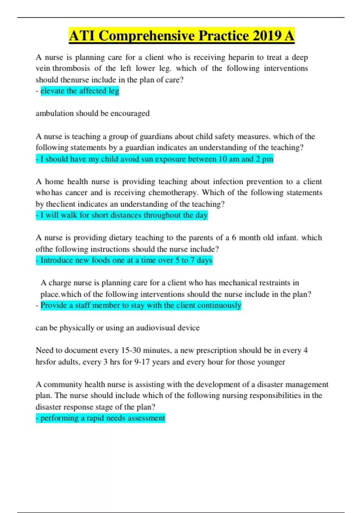 ATI Comprehensive Practice 2019 A A nurse is planning care for a client who is receiving heparin to treat a deep vein thrombosis of the left lower leg. which of the following interventions should thenurse include in the plan of care? - elevate the affected leg ambulation should be encouraged A nurse is teaching a group of guardians about child safety measures. which of the following statements by a guardian indicates an understanding of the teaching? - I should have my child avoid sun exposure between 10 am and 2 pm A home health nurse is providing teaching about infection prevention to a client who has cancer and is receiving chemotherapy. Which of the following statements by theclient indicates an understanding of the teaching? - I will walk for short distances throughout the day A nurse is providing dietary teaching to the parents of a 6 month old infant. which ofthe following instructions should the nurse include? - Introduce new foods one at a time over 5 to 7 days A charge nurse is planning care for a client who has mechanical restraints in of the following interventions should the nurse include in the plan? - Provide a staff member to stay with the client continuously can be physically or using an audiovisual device Need to document every 15-30 minutes, a new prescription should be in every 4 hrsfor adults, every 3 hrs for 9-17 years and every hour for those younger A community health nurse is assisting with the development of a disaster management plan. The nurse should include which of the following nursing responsibilities in the disaster response stage of the plan? - performing a rapid needs assessment A nurse manager is assisting with the orientation of a newly licensed nurse. which of the following actions by the nurse requires the nurse manager to intervene? - tells the hospital chaplain a clients diagnosis A nurse is caring for a client who is in labor at 39 weeks of gestation. during the second stage of labor, the nurse observes early deceleration on the monitor tracing. which of the following actions should the nurse take? - continue observing the fetal heart rate these are an expected finding A nurse manager is planning to make changes to the current scheduling system on the unit. to facilitate the staff's acceptance of this change, which of the following actionsshould the nurse manager take first? - provide information about scheduling issues to the staff unfreezing stage - increase understanding of why change is needed A nurse is planning teaching about allowable foods for a client who has a history ofuric acid based urinary calculi formation. which of the following foods should the nurse include in the teaching? - oranges can eat citrus fruits no chicken, no organ meats like liver, no red wine (avoiding purine) A charge nurse is teaching a newly licensed nurse how to identify true labor. which of the following should the nurse include in the teaching? - the cervix transitions to an anterior position Contractions will be felt in the lower abdomen and back, intensity increases withambulation, cervix shortens and thins A nurse on a medical surgical unit is caring for a client prior to a surgical procedure. which of the following findings should indicate to the nurse that the client has the ability to sign the informed consent? - the client is able to accurately describe the upcoming procedure A charge nurse assigns a newly licensed nurse to care for a client who has a chest tube. The nurse expresses concern about having limited experience with monitoring chest tube drainage. which of the following actions should the charge nurse take first to provide teaching about chest tubes? - ask the nurse about their knowledge of the procedure A nurse is teaching a client who has a new prescription for estradiol. for which of thefollowing adverse effects of this medication should the nurse instruct the client to monitor and report to the provider? - headaches - can be indicative of a thromboembolic stroke A nurse is preparing to administer diazepam 0.3mg/kg IV bolus to a toddler whoweighs 22 lb and is experiencing a grand maul seizure. availabale is diazepam solution for injection 5mg/mL. how many mL should the nurse administer? 0 - 0.6 mL A nurse is caring for a client who is 12 hours postoperative, is receiving PCA for paincontrol, and requires a blood pressure check in 10 min. which of the following staff members should the nurse assign to collect the information? - An assistive personnel (AP) who is assisting a client to return to bed A nurse is creating a plan of care for a child who has acute lymphoid leukemia and an absolute neutrophil count of 400/mm^3. which of the following interventions should the nurse include in the plan? - withhold administering the varicella vaccine to the child - it is a live vaccine and should not be given