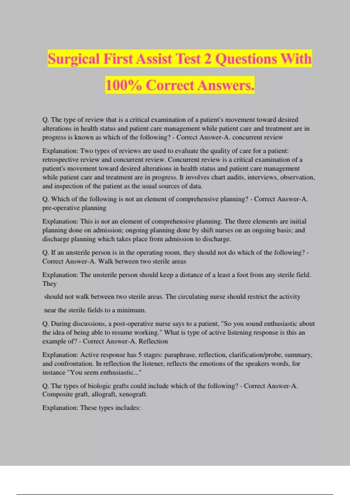 Surgical First Assist Test 2 Questions With 100% Correct Answers. Q. The type of review that is a critical examination of a patient's movement toward desired alterations in health status and patient care management while patient care and treatment are in progress is known as which of the following? - Correct Answer-A. concurrent review Explanation: Two types of reviews are used to evaluate the quality of care for a patient: retrospective review and concurrent review. Concurrent review is a critical examination of a patient's movement toward desired alterations in health status and patient care management while patient care and treatment are in progress. It involves chart audits, interviews, observation, and inspection of the patient as the usual sources of data. Q. Which of the following is not an element of comprehensive planning? - Correct Answer-A. pre-operative planning Explanation: This is not an element of comprehensive planning. The three elements are initial planning done on admission; ongoing planning done by shift nurses on an ongoing basis; and discharge planning which takes place from admission to discharge. Q. If an unsterile person is in the operating room, they should not do which of the following? - Correct Answer-A. Walk between two sterile areas Explanation: The unsterile person should keep a distance of a least a foot from any sterile field. They should not walk between two sterile areas. The circulating nurse should restrict the activity near the sterile fields to a minimum. Q. During discussions, a post-operative nurse says to a patient, "So you sound enthusiastic about the idea of being able to resume working." What is type of active listening response is this an example of? - Correct Answer-A. Reflection Explanation: Active response has 5 stages: paraphrase, reflection, clarification/probe, summary, and confrontation. In reflection the listener, reflects the emotions of the speakers words, for instance "You seem enthusiastic..." Q. The types of biologic grafts could include which of the following? - Correct Answer-A. Composite graft, allograft, xenograft. Explanation: These types includes: Composite grafts Allografts Xenografts Autograft Split-thickness skin graft Full-thickness skin graft Q. What is NOT the responsibility of the nurse to advocate? - Correct Answer-A. Intervention Explanation: Nurses have an obligation to advocate for the safety of their patients. They also need to advocate for patient dignity, privacy, comfort, and rights. Intervention is not advocacy. Q. Which of the following would indicate that a person is in a pre-diabetic stage? - Correct Answer-A. fasting blood glucose is 110 mg/dL Explanation: Prediabetes can occur when the fasting blood glucose is greater than 100 mg/dL and less than 126 mg/dL or when postprandial blood glucose is greater than 140 mg/dL and less than 200 mg/dL. Fasting blood glucose of 110 mg/dL is therefore pre-diabetic. Q. Allergic contact dermatitis is cause by which of the following? - Correct Answer-A. Exposure to a product that causes an inflammatory reaction Explanation: Patients can experience irritant contact dermatitis as well as allergic contract dermatitis as an adverse outcome for administration of skin medications. Allergic contact dermatitis is due to exposure to a product that causes an inflammatory reaction. Q. Glands located near the hair follicles that secrete the oils which help to keep skin and hair soft and moist would be considered? - Correct Answer-A. Sebaceous glands Explanation: The sebaceous glands release oils when necessary which helps to keep skin and hair soft and moist. These glands are located in the dermis layer of the skin. Q. A patient begins crying during a routine history. What assessment would you begin? - Correct Answer-A. Psychosocial Explanation: The patient is obviously in emotional turmoil. A psychosocial assessment will be useful in determining the cause of the upset. It will also provide a more complete diagnosis. Q. Of the following, which would be the most commonly used type of scalpel? - Correct Answer-A. A reusable handle with a disposable blade Explanation: The typical scalpel handle is made of brass and is reusable. The typical blade is made of carbon steel and is disposable. The reusable handle and disposable blade are the most commonly used ones today. There are scalpels that are totally disposable. Q. When positioning the surgical patient, the arm is extended on an armboard. Which of the following could be utilized instead of a shoulder brace to help stabilize the patient? - Correct Answer-A. Ankle strap Explanation: When the patient's arm is extended and a should brace is used, it has the potential to cause nerve compression. In this case, ankle straps are sometimes used to help stabilize the patient. Q. The objectives of aseptic technique could include all of the following except? - Correct Answer-A. Conceptions Explanation: These objectives help to prevent contamination of the sterile field. These objectives could include: Containment Confinement Reduction Elimination of microorganisms Q. Ophthalmic surgery requires a significant amount of specialized equipment and instruments. Which of the following equipment is used specifically in the ophthalmic operating suite? - Correct Answer-A. Phacoemulsification unit Explanation: Nerves stimulators are used to identify and check nerve response during neurosurgery. Fracture tables and arthroscopes are used during orthopedic surgery. The phacoemulsification unit is used during ophthalmic surgery. Q. What is an advantage of polyester and polypropylene sutures? - Correct Answer-A. They cause minimal inflammation Synthetic sutures such as polyester and polypropylene sutures are used because they retain their strength longer and have higher tensile strength than natural fibers, but not as high as metal sutures. They also cause less irritation than silk or natural fiber sutures. Q. Which condition will not contribute to volume ove
