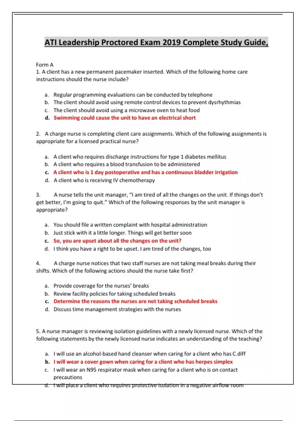 ATI Leadership Proctored Exam 2019 Complete Study Guide, Form A 1. A client has a new permanent pacemaker inserted. Which of the following home care instructions should the nurse include? a. Regular programming evaluations can be conducted by telephone b. The client should avoid using remote control devices to prevent dysrhythmias c. The client should avoid using a microwave oven to heat food d. Swimming could cause the unit to have an electrical short 2. A charge nurse is completing client care assignments. Which of the following assignments is appropriate for a licensed practical nurse? a. A client who requires discharge instructions for type 1 diabetes mellitus b. A client who requires a blood transfusion to be administered c. A client who is 1 day postoperative and has a continuous bladder irrigation d. A client who is receiving IV chemotherapy 3. A nurse tells the unit manager, “I am tired of all the changes on the unit. If things don’t get better, I’m going to quit.” Which of the following responses by the unit manager is appropriate? a. You should file a written complaint with hospital administration b. Just stick with it a little longer. Things will get better soon c. So, you are upset about all the changes on the unit? d. I think you have a right to be upset. I am tired of the changes, too 4. A charge nurse notices that two staff nurses are not taking meal breaks during their shifts. Which of the following actions should the nurse take first? a. Provide coverage for the nurses’ breaks b. Review facility policiesfor taking scheduled breaks c. Determine the reasons the nurses are not taking scheduled breaks d. Discusstime management strategies with the nurses 5. A nurse manager is reviewing isolation guidelines with a newly licensed nurse. Which of the following statements by the newly licensed nurse indicates an understanding of the teaching? a. I will use an alcohol-based hand cleanser when caring for a client who has C.diff b. I will wear a cover gown when caring for a client who has herpes simplex c. I will wear an N95 respirator mask when caring for a client who is on contact precautions d. I will place a client who requires protective isolation in a negative airflow room 6. A staff nurse is supervising a newly licensed nurse who is preparing to administer an intermittent tube feeding to a client. Which of the following actions by the newly licensed nurse is appropriate? a. Adding colored food dye to the formula b. Flushing the tube with 15 mL of water c. Elevating the head of the bed to a 20-degree angle d. Checking residual volume before each feeding 7. A nurse is preparing an education program about professional codes of ethics for nurses. Which of the following information should the nurse plan to include? a. A code of ethics is a step-by-step approach to decision-making b. A code of ethics is a set of principles for nursing practice c. A code of ethics is legally binding d. A code of ethics outlines the nurse’s scope of practice 8. A nurse receives change-of-shift report for the following four clients. Which of the following clients should the nurse assess first? a. An older adult client who has bacterial pneumonia and a new onset of restlessness b. A client who is 1-day postoperative following hip fracture repair and reports a pain level of 6 on a scale from 0 to 10 c. A middle adult client who has diabetes mellitus and a morning blood glucose of 172 mg/dL d. A client who has myasthenia gravis with ptosis and has developed urinary incontinence 9. A charge nurse is assessing staff knowledge about safety procedures regarding needle-stick injuries. Which of the following statements by a nurse indicates appropriate understanding of these safety procedures? a. Prophylactic treatment should be initiated after a needle-stick during preparation of an injection b. The needle should be recapped to prevent injury during transport to the biohazard container c. I should stop the bleeding as soon as possible following a needle-stick injury d. An incident report should be completed if a client receives a stick from her own used needle 10. A case manager is reviewing documentation on several clients and notes a progress reportthat falsely identifies a client as HIV-positive due to multiple sexual partners. The nurse manager should identify that which of the following torts has occurred? a. Libel b. Battery c. Slander d. Negligence 11. A charge nurse making rounds observes that an assistive personnel (AP) has applied wrist restraints to a client who is agitated and does not have a prescription for restraints. Which of the following actions should the nurse take first? a. Inform the unit manager of the incident b. Review the chart for non-restraint alternatives for agitation c. Remove the restraints from the client’s wrists d. Speak with the AP about the incident 12. To resolve a conflict between staff members regarding potential changes in policy, a nurse manager decides to implement the changes she prefers regardless of the feelings of those who oppose those changes. Which of the following conflict resolution strategies is the nurse manager using? a. Compromising b. Collaborating c. Cooperating d. Competing 13. A nurse is caring for a client and notices fraying on the electrical cord of the client’s IV pump. Which of the following actions is the priority for the nurse to take? a. Remove the IV pump from the client’s room b. Check the expiration date of the inspection sticker c. Report the problem to the engineering team d. Request a replacement IV pump 14. A nurse is providing discharge teaching to the parent of a toddler who has a new diagnosis of asthma. The parent states she is unable to afford the nebulizer prescribed for the child. Which of the following referrals should the nurse recommend? a. Pharmacist b. Child protective services c. Social worker d. Respiratory therapist