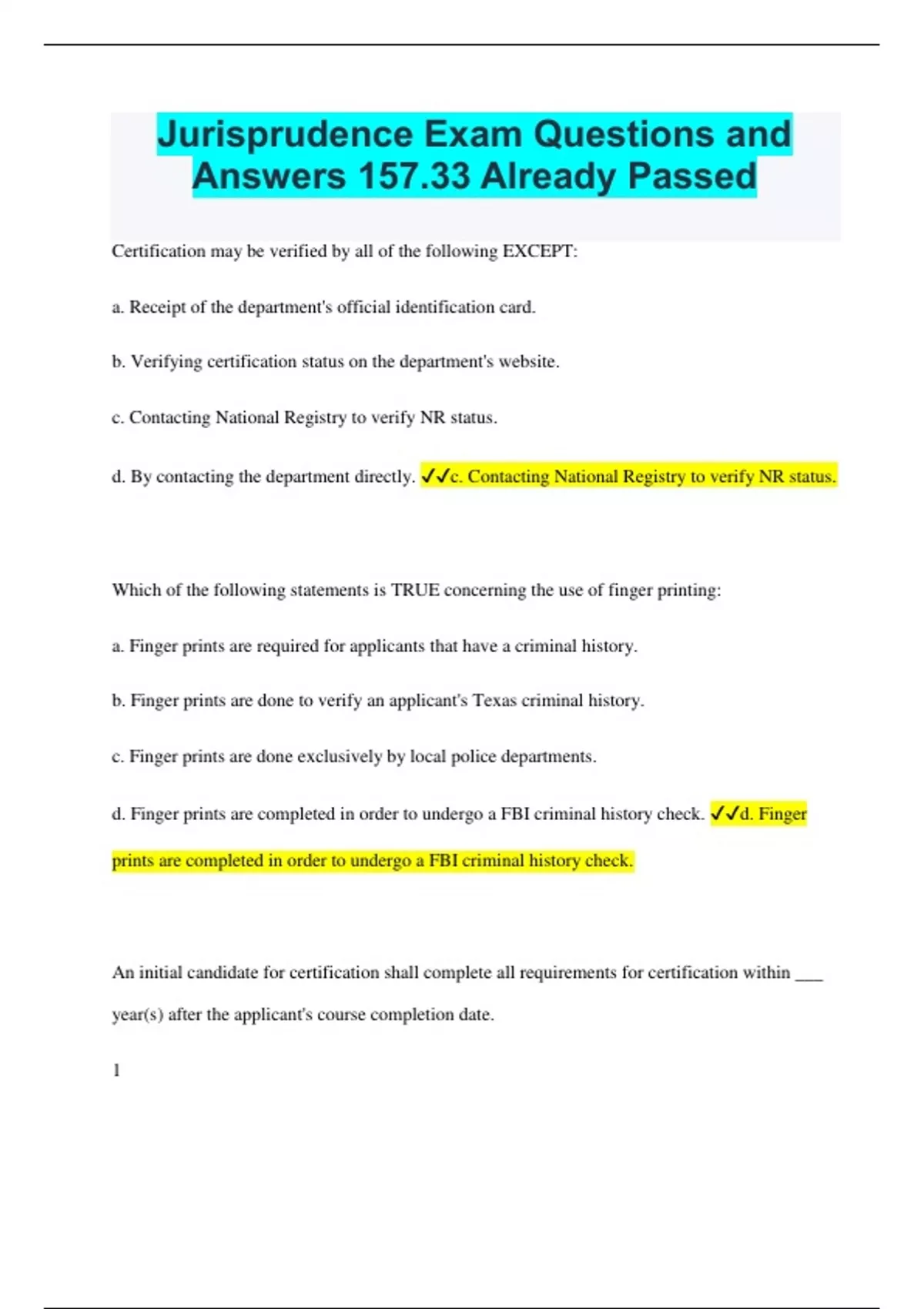 Jurisprudence Exam Questions and Answers 157.33 Already Passed Certification may be verified by all of the following EXCEPT: a. Receipt of the department's official identification card. b. Verifying certification status on the department's website. c. Contacting National Registry to verify NR status. d. By contacting the department directly. c. Contacting National Registry to verify NR status. Which of the following statements is TRUE concerning the use of finger printing: a. Finger prints are required for applicants that have a criminal history. b. Finger prints are done to verify an applicant's Texas criminal history. c. Finger prints are done exclusively by local police departments. d. Finger prints are completed in order to undergo a FBI criminal history check. d. Finger prints are completed in order to undergo a FBI criminal history check. An initial candidate for certification shall complete all requirements for certification within ___ year(s) after the applicant's course completion date. 1 2 3 4 2 In order to be certified in Texas, a candidate must pass the following exam: a. National Registry exam b. Texas Department of State Health Services (DSHS) exam c. Both the National Registry and DSHS exams d. None of the above. a. National Registry exam A candidate for emergency medical services (EMS) certification shall be at least 18 years of age and have a high school diploma or GED certificate. A home school diploma is acceptable if it is accompanied by: a. A letter from the Texas Education Agency b. The student's transcript evaluated by a High School Principal in their town. c. No other document is required. d. A letter from a state certified teacher. c. No other document is required. An initial candidate for certification shall complete all requirements for certification no later than ___ years after the candidate's course completion date. a. 2 Years b. 1 Year c. 6 Months d. 90 Days a. 2 Years A person currently certified by another state may apply for equal or lower level Texas certification by submitting a reciprocity application and a nonrefundable fee of $120. Which of the following additional requirements is false? a. The candidate must pass the Texas Assessment Exam b. All applicants shall submit fingerprints through the state approved fingerprinting service to undergo an FBI fingerprint criminal history check. c. The applicant has completed a state approved jurisprudence examination to determine the knowledge on state EMS laws, rules, and policies. d. The candidate must pass the National Registry Assessment Exam. a. The candidate must pass the Texas Assessment Exam During the certification license period, the EMS Personnel responsibilities shall notify the department of a current and/or valid mailing address within ____ days of any changes. a. 7 Days b. 10 Days c. 30 Days d. 45 Days c. 30 Days Of the requirements listed below which one is not a requirement for certification: a. the candidate has completed the jurisprudence exam b. be at least 21 years of age c. have successfully completed a Department of State Health Services approved course d. have a High School Diploma or GED b. be at least 21 years of age When can a certified EMT, AEMT, Paramedic apply for inactive certification? a. within 2 years after the certificate expiration date b. only after they have recertified once c. only with permission from the Medical Director d. anytime during the certification period or 1 (one) year after the certificate expiration date d. anytime during the certification period or 1 (one) year after the certificate expiration date For EMT and above certificants, requirements for reciprocity include all of the following except: a. Current NR Certification and/or state EMS certification b. Completion of a state approved jurisprudence exam c. Submission of a nonrefundable fee with the application. d. Possessing an Associate or Bachelor's degree d. Possessing an Associate or Bachelor's degree Certification requirements for a candidate for EMS certification includes all of the following EXCEPT: a) Taking a department approved Emergency Vehicle Operations training course. b) Be at least 18 years of age. c) Have a high school diploma or GED d) Successfully complete a Department of State Health Services approved course. a) Taking a department approved Emergency Vehicle Operations training course. The length of certification for EMS personnel in the State of Texas is: a. 2 Years b. 4 Years c. 3 Years d. 6 Years b. 4 Years EMS personnel must notify the department within ____ days of a change of address. a. 15 b. 45 c. 30 d. 60 c. 30 EMS personnel are required to notify the employer, appropriate legal authority, or department within ______ of the abuse or injury to a patient or the public. a) 24 hours b) 5 days c) 3 days d) 12 hours a) 24 hours In what timeframe must you notify the department of a current and/or valid mailing address? a. within 5 days b. within 10 days c. within 30 days d. within 45 days c. within 30 days Which of the following responsibilities of EMS personnel is not required by the department? a. Following the approved medical director's protocol and policies b. Certified or licensed EMS personnel must carry their department issued certification or license on their person while on duty c. Taking accurate, complete and/or clearly written patient care reports d. Taking precautions to prevent the misappropriation of medications, supplies, equipment, personal items, or money belonging to the patient, employer or any person or entity b. Certified or licensed EMS personnel must carry their department issued certification or license on their person while on duty How can a certification be verified? a. Official department identification card b. Using the department's online certification search c. Contacting the department directly d. All of the above d. All of the above An individual who holds a current Texas EMS certification or paramedic license may be certified at a lower level volunt