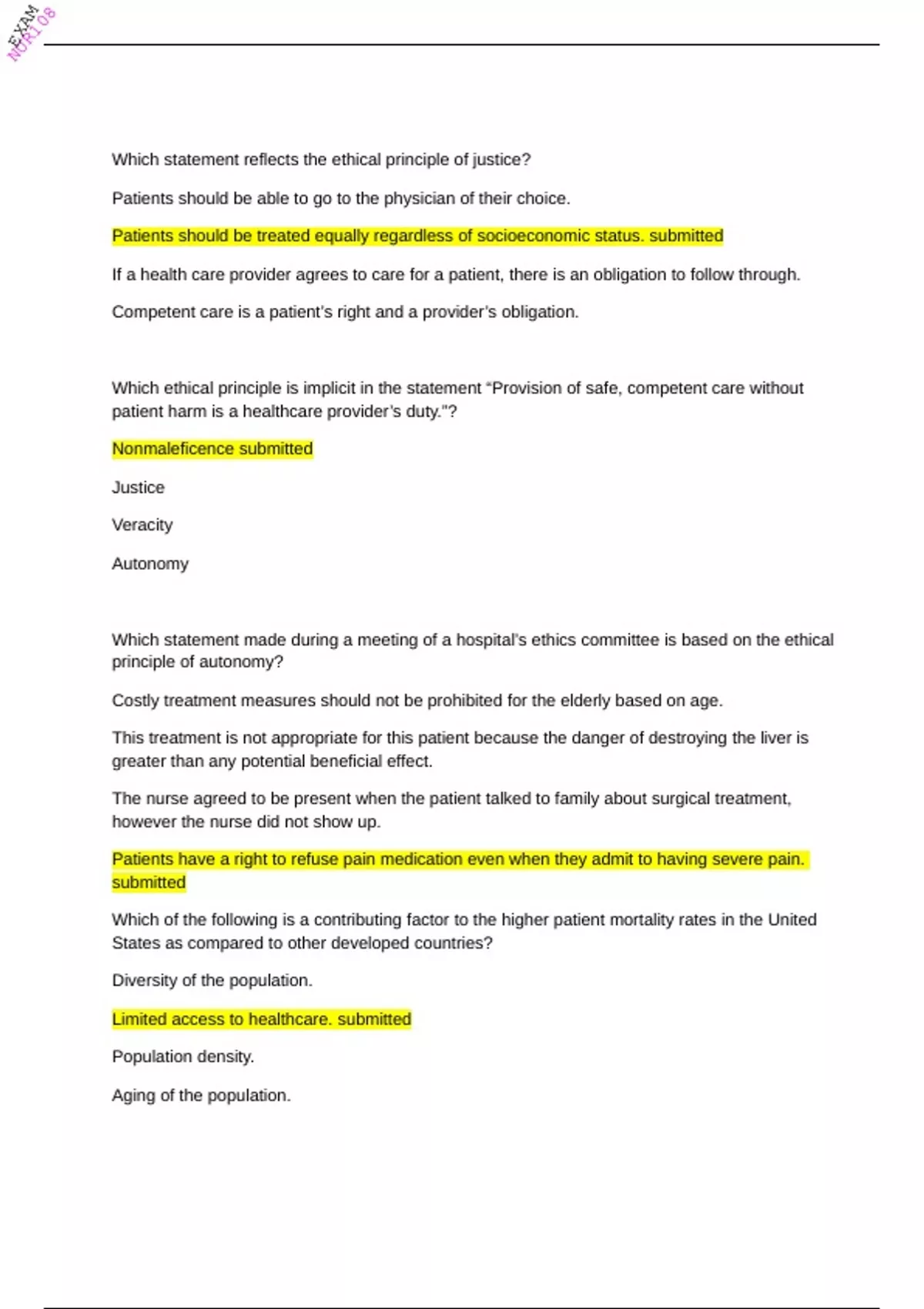 Which statement reflects the ethical principle of justice? Patients should be able to go to the physician of their choice. Patients should be treated equally regardless of socioeconomic status. submitted If a health care provider agrees to care for a patient, there is an obligation to follow through. Competent care is a patient’s right and a provider’s obligation. Which ethical principle is implicit in the statement “Provision of safe, competent care without patient harm is a healthcare provider’s duty.”? Nonmaleficence submitted Justice Veracity Autonomy