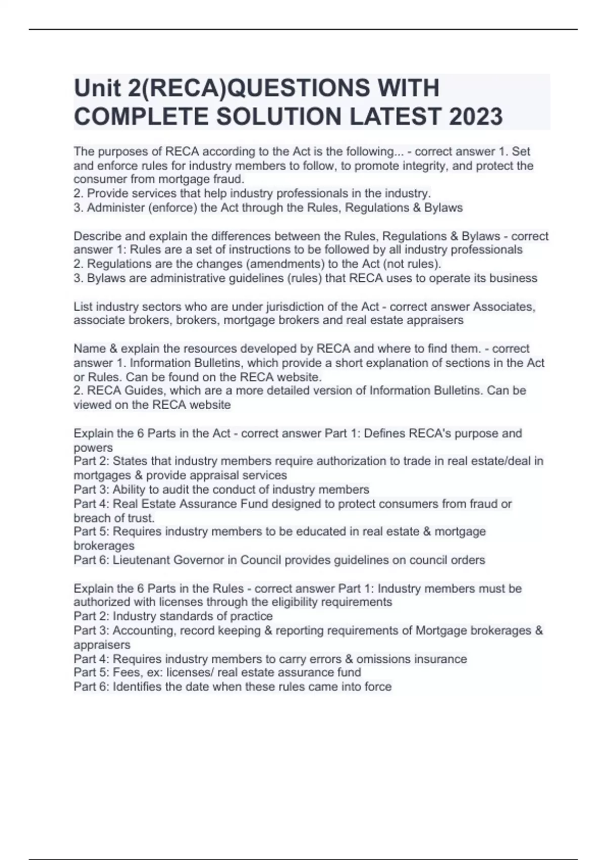Unit 2(RECA)QUESTIONS WITH COMPLETE SOLUTION LATEST 2023/2024The purposes of RECA according to the Act is the following... - correct answer 1. Set and enforce rules for industry members to follow, to promote integrity, and protect the consumer from mortgage fraud. 2. Provide services that help industry professionals in the industry. 3. Administer (enforce) the Act through the Rules, Regulations & Bylaws Describe and explain the differences between the Rules, Regulations & Bylaws - correct answer 1: Rules are a set of instructions to be followed by all industry professionals 2. Regulations are the changes (amendments) to the Act (not rules). 3. Bylaws are administrative guidelines (rules) that RECA uses to operate its business List industry sectors who are under jurisdiction of the Act - correct answer Associates, associate brokers, brokers, mortgage brokers and real estate appraisers Name & explain the resources developed by RECA and where to find them. - correct answer 1. Information Bulletins, which provide a short explanation of sections in the Act or Rules. Can be found on the RECA website. 2. RECA Guides, which are a more detailed version of Information Bulletins. Can be viewed on the RECA website Explain the 6 Parts in the Act - correct answer Part 1: Defines RECA's purpose and powers Part 2: States that industry members require authorization to trade in real estate/deal in mortgages & provide appraisal services Part 3: Ability to audit the conduct of industry members Part 4: Real Estate Assurance Fund designed to protect consumers from fraud or breach of trust. Part 5: Requires industry members to be educated in real estate & mortgage brokerages Part 6: Lieutenant Governor in Council provides guidelines on council orders Explain the 6 Parts in the Rules - correct answer Part 1: Industry members must be authorized with licenses through the eligibility requirements Part 2: Industry standards of practice Part 3: Accounting, record keeping & reporting requirements of Mortgage brokerages & appraisers Part 4: Requires industry members to carry errors & omissions insurance Part 5: Fees, ex: licenses/ real estate assurance fund Part 6: Identifies the date when these rules came into force