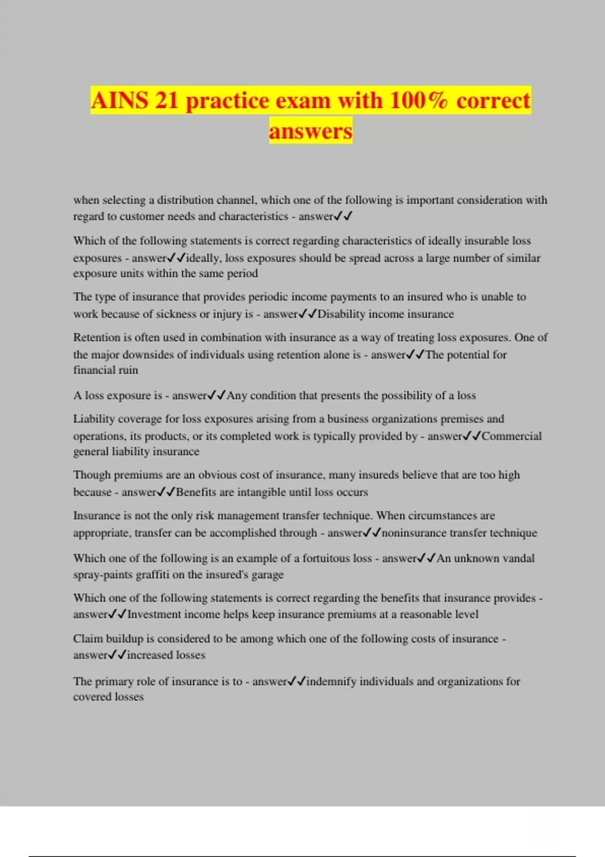 AINS 21 practice exam with 100% correct answers when selecting a distribution channel, which one of the following is important consideration with regard to customer needs and characteristics - answer Which of the following statements is correct regarding characteristics of ideally insurable loss exposures - answerideally, loss exposures should be spread across a large number of similar exposure units within the same period The type of insurance that provides periodic income payments to an insured who is unable to work because of sickness or injury is - answerDisability income insurance Retention is often used in combination with insurance as a way of treating loss exposures. One of the major downsides of individuals using retention alone is - answerThe potential for financial ruin A loss exposure is - answerAny condition that presents the possibility of a loss Liability coverage for loss exposures arising from a business organizations premises and operations, its products, or its completed work is typically provided by - answerCommercial general liability insurance Though premiums are an obvious cost of insurance, many insureds believe that are too high because - answerBenefits are intangible until loss occurs Insurance is not the only risk management transfer technique. When circumstances are appropriate, transfer can be accomplished through - answernoninsurance transfer technique Which one of the following is an example of a fortuitous loss - answerAn unknown vandal spray-paints graffiti on the insured's garage Which one of the following statements is correct regarding the benefits that insurance provides - answerInvestment income helps keep insurance premiums at a reasonable level Claim buildup is considered to be among which one of the following costs of insurance - answerincreased losses The primary role of insurance is to - answerindemnify individuals and organizations for covered losses Coverage for money, securities, and other property from various causes of loss such as burglary, robbery, theft, and employee dishonesty typically is provided by - answercommercial crime insurance Which of the following is an opportunity cost of insurance - answerAn insureds funds that could be invested elsewhere if purchasing insurance were not necessary Coverage for miscellaneous types of property such as movable property, goods in domestic transit, and property use in transportation and communication, typically is provided by - answerinland marine insurance For insurers to utilize pooling most effectively and prevent catastrophic losses, the insured exposure units need to be - answerindependent Some loss exposures are not easy to retain, avoid, or control. What risk management techniques is frequently used to treat such exposures - answertransfer Sometimes the existence of insurance encourages losses. the result of this phenomenon is that in - answerincreases the total cost of insurance Pravalt Construction Company pays less than its competitors for workers compensation insurance because Pravalt has had substantially fewer employee injuries than other firms in its class. this illustrates which one of the following benefits of insurance - answerpromote risk control As a single mother on a very tight budget, Ciara is tempted to skimp on her insurance. However, her friend Mehmet tells her not to skimp on insurance, because it will help manage her cash flows. Which one of the following examples best illustrates Mehmet's point - answerWhen her car's windshield breaks, Ciara has to pay only $100 of the $600 cost of replacing it A small business owner concerned about something happening and not being able to work or earn a living for extended period of time due to an accident should purchase - answerDisability insurance Adhering to the characteristics of an ideally insurable loss exposure in selling insurance help assure that - answerThe insurer is able to charge a premium that the insured can afford to pay Which of the following statements is correct with regard to risk and ideally insurable characteristics of loss exposures - answerindemnification is the process of restoring an insured to pre-loss financial condition Which one of the following statements is correct - answerinsurers investment income helps keep premiums at reasonable
