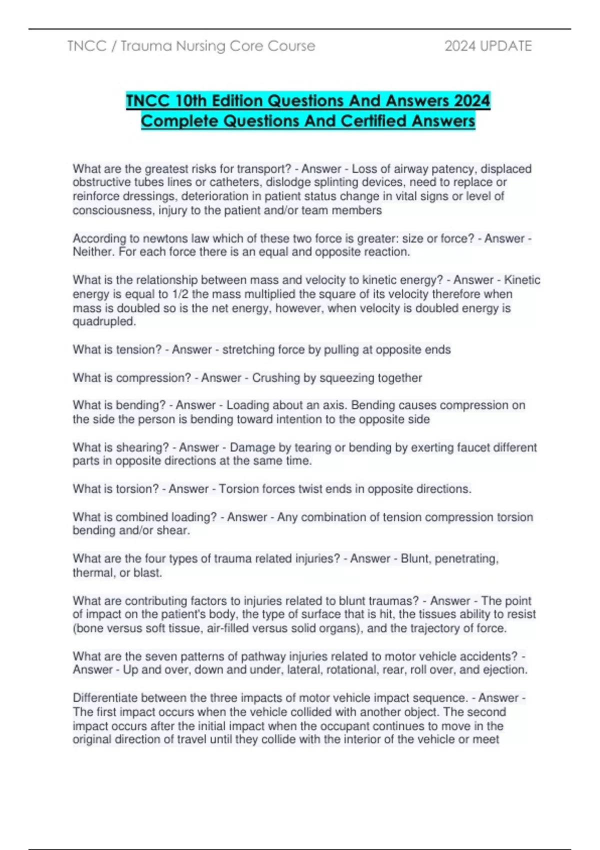 TNCC 10th Edition Questions And Answers 2024 Complete Questions And Certified Answers What are the greatest risks for transport? - Answer - Loss of airway patency, displaced obstructive tubes lines or catheters, dislodge splinting devices, need to replace or reinforce dressings, deterioration in patient status change in vital signs or level of consciousness, injury to the patient and/or team members According to newtons law which of these two force is greater: size or force? - Answer - Neither. For each force there is an equal and opposite reaction. What is the relationship between mass and velocity to kinetic energy? - Answer - Kinetic energy is equal to 1/2 the mass multiplied the square of its velocity therefore when mass is doubled so is the net energy, however, when velocity is doubled energy is quadrupled. What is tension? - Answer - stretching force by pulling at opposite ends What is compression? - Answer - Crushing by squeezing together What is bending? - Answer - Loading about an axis. Bending causes compression on the side the person is bending toward intention to the opposite side What is shearing? - Answer - Damage by tearing or bending by exerting faucet different parts in opposite directions at the same time. What is torsion? - Answer - Torsion forces twist ends in opposite directions. What is combined loading? - Answer - Any combination of tension compression torsion bending and/or shear. What are the four types of trauma related injuries? - Answer - Blunt, penetrating, thermal, or blast. What are contributing factors to injuries related to blunt traumas? - Answer - The point of impact on the patient's body, the type of surface that is hit, the tissues ability to resist (bone versus soft tissue, air-filled versus solid organs), and the trajectory of force. What are the seven patterns of pathway injuries related to motor vehicle accidents? - Answer - Up and over, down and under, lateral, rotational, rear, roll over, and ejection. Differentiate between the three impacts of motor vehicle impact sequence. - Answer - The first impact occurs when the vehicle collided with another object. The second impact occurs after the initial impact when the occupant continues to move in the original direction of travel until they collide with the interior of the vehicle or meet resistance. The third impact occurs when internal structures collide within the body cavity. What are the three factors that contribute to the damage caused by penetrating trauma's? - Answer - The point of impact, the velocity and speed of impact, and the proximity to the object. What causes the primary effects of blast traumas? - Answer - The direct blast effects. Types of injuries include last long, tympanic membrane rupture and middle ear damage, abdominal hemorrhage and perforation, global rupture, mild Trumatic brain injury. What causes the secondary effects of blast traumas? - Answer - Projectiles propelled by the explosion. Injuries include penetrating or blunt injuries or I penetration. What causes the tertiary effects of blast traumas? - Answer - Results from individuals being thrown by the blast wind. Injuries include hole or partial body translocation from being thrown against a hard service: blunt or penetrating trauma's, fractures, traumatic amputations. What causes quarternary effects of blast traumas? - Answer - All explosion related injuries, illnesses, or diseases not due to the first three mechanisms. Injuries include external and internal burns, crush injuries, closed and open brain injuries, asthmatic or breathing problems from dust smoke or toxic fumes, angina, or hyper glycemia and hypertension. What causes quinary effects of blasts traumas? - Answer - Those associated with exposure to hazardous materials from radioactive, biologic, or chemical components of a blast. Injuries include a variety of health effects depending on agent. What are the three processes that transfer oxygen from the air to the lungs and blood stream - Answer - Ventilation: the active mechanical movement of air into and out of the lungs; diffusion: the passive movement of gases from an area of higher concentration to an area of lower concentration; and perfusion: the movement of blood to and from the lungs as a delivery medium of oxygen to the entire body.
