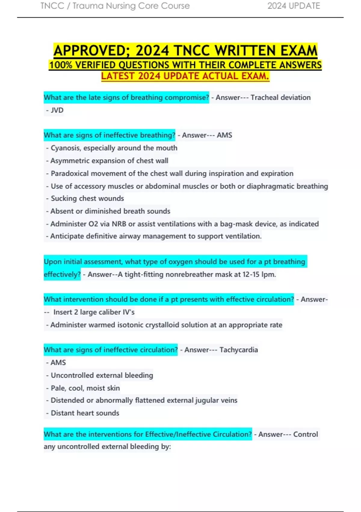 APPROVED; 2024 TNCC WRITTEN EXAM 100% VERIFIED QUESTIONS WITH THEIR COMPLETE ANSWERS LATEST 2024 UPDATE ACTUAL EXAM. What are the late signs of breathing compromise? - Answer--- Tracheal deviation - JVD What are signs of ineffective breathing? - Answer--- AMS - Cyanosis, especially around the mouth - Asymmetric expansion of chest wall - Paradoxical movement of the chest wall during inspiration and expiration - Use of accessory muscles or abdominal muscles or both or diaphragmatic breathing - Sucking chest wounds - Absent or diminished breath sounds - Administer O2 via NRB or assist ventilations with a bag-mask device, as indicated - Anticipate definitive airway management to support ventilation. Upon initial assessment, what type of oxygen should be used for a pt breathing effectively? - Answer--A tight-fitting nonrebreather mask at 12-15 lpm. What intervention should be done if a pt presents with effective circulation? - Answer--- Insert 2 large caliber IV's - Administer warmed isotonic crystalloid solution at an appropriate rate What are signs of ineffective circulation? - Answer--- Tachycardia - AMS - Uncontrolled external bleeding - Pale, cool, moist skin - Distended or abnormally flattened external jugular veins - Distant heart sounds What are the interventions for Effective/Ineffective Circulation? - Answer--- Control any uncontrolled external bleeding by: - Applying direct pressure over bleeding site - Elevating bleeding extremity - Applying pressure over arterial pressure points - Using tourniquet (last resort). - Cannulate 2 large-caliber IV's and initiate infusions of an isotonic crystalloid solution - Use warmed solution - Use pressure bags to increase speed of IVF infusion - Use blood administration tubing for possible administration of blood - Use rapid infusion device based on protocol - Use NS 0.9% in same tubing as blood product - IV = surgical cut-down, central line, or both. - Blood sample to determine ABO and Rh group - IO in sternum, legs, arms or pelvis - Administer blood products - PASG (without interfering with fluid resuscitation) What are factors that contribute to ineffective ventilation? - Answer--- AMS - LOC - Neurologic injury - Spinal Cord Injury - Intracranial Injury - Blunt trauma - Pain caused by rib fractures - Penetrating Trauma - Preexisting hx of respiratory diseases - Increased age What medications are used during intubation? - Answer--LOAD Mnemonic: L = Lidocaine O = Opioids A = Atropine D = Defasiculating agents What are the Rapid Sequence Intubation Steps? - Answer--PREPARATION: - gather equipment, staffing, etc. PREOXYGENATION: - Use 100% O2 (prevent risk of aspiration). PRETREATMENT: - Decrease S/E's of intubation PARALYSIS WITH INDUCTION: - Pt has LOC, then administer neuromuscular blocking agent PROTECTION AND POSITIONING: - Apply pressure over cricoid cartilage (minimizes likelihood of vomiting and aspiration PLACEMENT WITH PROOF - Each attempt NOT to exceed 30 seconds, max of 3 attempts. Ventilate pt 30-60 seconds between attempts. -After intubation, inflate the cuff - Confirm tube placement w/exhaled CO2 detector. POSTINTUBATION MANAGEMENT: - Secure ET tube - Set ventilator settings - Obtain Chest x-ray - Continue to medicate - Recheck VS and pulse oxtimetry What is a Combitube? - Answer--A dual-lumen, dual-cuff airway that can be placed blindly into the esophagus to establish an airway. If inadvertently placed into trachea, it can be used as a temporary ET tube. There are only two sizes: small adult and larger adult. What is a Laryngeal Mask Airway? - Answer--Looks like an ET tube but is equipped with an inflatable, elliptical, silicone rubber collar at the distal end. It is designed to cover the supraglottic area. ILMA, does not require laryngoscopy and visualization of the chords. What is Needle Cricothyrotomy - Answer--Percutaneous transtracheal ventilation. (temporary) Complications include: - inadequate ventilation causing hypoxia - hematoma formation - esophageal perforation - aspiration - thyroid perforation - subcutaneous emphysema What is Surgical Cricothyrotomy? - Answer--Making an incision in cricothyroid membrane and placing a cuffed endo or trach tube into trachea. This is indicated when other methods of airway management have failed and pt cannot be adequately ventilated and oxygenated. Complications include: - Aspiration - Hemorrhage or hematoma formation or both - Lac to trachea or esophagus - Creation of a false passage - Laryngeal stenosis How do you confirm ET Tube/Alternative Airway Placement? - Answer--- Visualization of the chords - Using bronchoscope to confirm placement - Listening to breath sounds over the epigastrum and chest walls while ventilating the pt - CO2 detector - Esophageal detection device - Chest x-ray How do you inspect the chest for adequate ventilation? - Answer--Observe: - mental status - RR and pattern - chest wall symmetry - any injuries - patient's skin color (cyanosis?) - JVD or tracheal deviation? (Tension pneumothorax) What are you looking for when auscultating lung sounds? - Answer--Absence of BS: - Pneumothorax - Hemothorax - Airway Obstruction Diminished BS: - Splinting or shallow BS may be a result of pain What are you looking for when percussing the chest? - Answer--Dullness: - hemothorax Hyperresonance - Pneumothorax What are you looking for when palpating the chest wall, clavicles and neck? - Answer--- Tenderness - Swelling - subcutaneous emphysema - step-off deformities = These may indicate: esophageal, pleural, tracheal or bronchial injuries. Palpate trachea above suprasternal notch. Tracheal deviation may indicate a tension pneumothorax or massive hemothorax. What is the DOPE mnemonic? - Answer--D - Displaced tube O - Obstruction: Check secretions or pt biting tube P - Pneumothorax: Condition may occur from original trauma or barotrauma from ventilator E - Equipment failure: pt may have become detached from equipment or there's a kink in the tubing Explain Hypovolemic Shock. - Answe