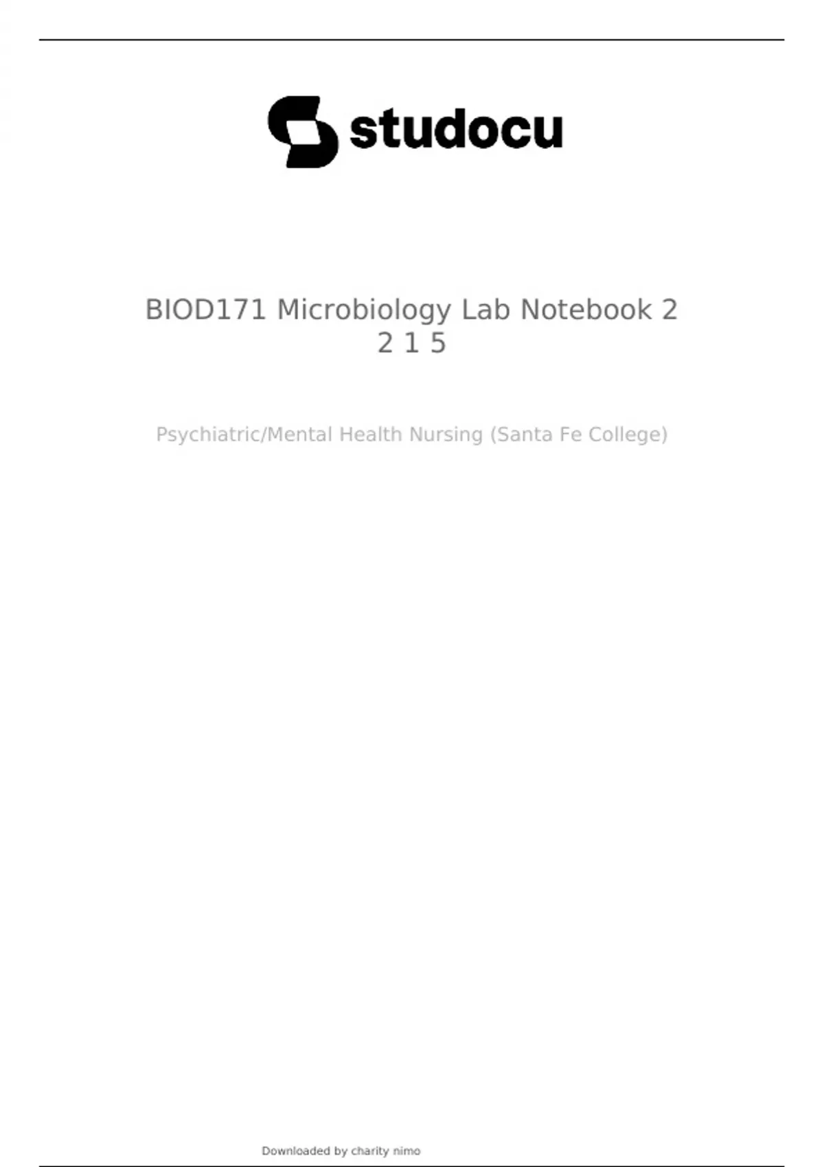 BIOD171 Microbiology Lab Notebook 2 2 1 5 Psychiatric/Mental Health Nursing (Santa Fe College) Studocu is not sponsored or endorsed by any college or university Portage Learning BIO 171- Microbiology Lab Notebook Lab Notebook Bookmarks (click to navigate): Lab 1 Notebook Lab 2 Notebook Lab 3 Notebook Lab 4 Notebook Lab 5 Notebook Lab 6 Notebook Lab 7 Notebook Lab 8 Notebook Lab 9 Notebook 1 Lab 1 Notebook Back to Home Page Title: KD01 Introduction to medical microbiology & lab notebook procedures Course Objectives: Cultivation of samples: growth conditions and equipment used Identification of samples: biochemical assays & tests available Evaluation of samples: microscopy- visualization and key characteristics of specimens Basic Equipment: Cleaning: Autoclave 125°C- uses heat, pressure, & steam to sterilize; autoclave will take minutes to sterilize & hot dry air which will take hours; before opening make sure it is depressurized and will have very hot air. Growing (bacteria/pathogens) – Fixed incubator 37°C is airtight, shelving for petri dishes - Shaker incubator 37°C shakes culture & rotates to aerate- liquid nutrient broth Visualizing: microscopy Storing: refrigerator @ 4°C to stop the growth and helps preserve samples & keeps long term Lab Safety 1. Never eat or drink in the lab: contamination risks 2. Use PPE (personal protection equipment): gloves- latex, nitrile (purple, blue, green),thermal, or cold gloves (liquid nitrogen): eyewear: lab coat- chemical spills 2 3. Never leave lab while wearing PPE: including bathroom, hallway, or cafeteria Outline of how to set up Notebook Objective: To establish an organized template for keeping experimental records, procedures, and results. Procedure: 1. This is where each step of a given protocol is recorded 2. Be sure to clearly indicate any deviations that may occur during the experiment- put them in red Notes: Additional (helpful) information placed here Results: A summary of the final outcome of the experiment should be described here 3 Lab 2 Notebook Back to Home Page Title: KD02 Introduction to Microscopy Objective: To learn basic parts of microscope and how to view a sample Procedure: 1. Review the parts of microscope 2. Load sample to be viewed 3. Choose magnification 4. Adjust microscope so the sample is clear Notes: Parts of microscope: 1. eye pieces (ocular lens): can be pulled apart; should be able to use both eyes and see one circle if not adjust 2. arm/neck: if moving this is what you will grab with one hand and hand under base 3. Objective lenses: this provides the magnification of the sample; shortest has the least magnification (4x, 10x, 40x,100x) 4. Stage: the flat surface that you place your sample; holds the sample via a clamp (squeeze together to place sample and release); stage clips raise up and lay on the glass coverslip 4 5. Focus knobs: located on the side of the arm/neck; Outside ring is the coarse adjustment – makes large steps in focus; Inner ring is the fine focus- you can see the specimen but need more detail. 5 6. Iris diaphragm: located below the stage determines how much light passes through the sample (the lever slides) 7. Base- the bottom of the microscope and should be steady and on flat surface Load sample to be viewed: 1. Put sample on stage and make sure it is secured 2. Turn on. Left hand side you can dim or brighten the light. You can use either the knob or the diaphragm to control the light. Types of Objectives: dry vs oil (required on higher magnification) add a drop of oil onto slide- helps with light refraction and lense will be embedded in the oil 3. Intensity of light source: too bright = saturation (can’t see); too dark = low visibility. Start midway leave iris open 4. Stage guides below stage 2 knobs: top controls movement of the stage forward/backward. Lower know moves left and right. These put specimen in range of viewing. 5. *if unsure of magnification: start on lowest power Power of Objective X Power of Eyepiece = Total magnification: 15 mm diameter object & total magnification is 200x larger and the diameter is 3000mm Eye pieces are labeled with magnification on them and are removable Coarse adjustment will raise or lower the stage- do not touch the sample with the lenses. Look through eyepiece and slowly make adjustments. There will be a pointer inside the eye piece you can spin the eye piece and the line will point to your sample