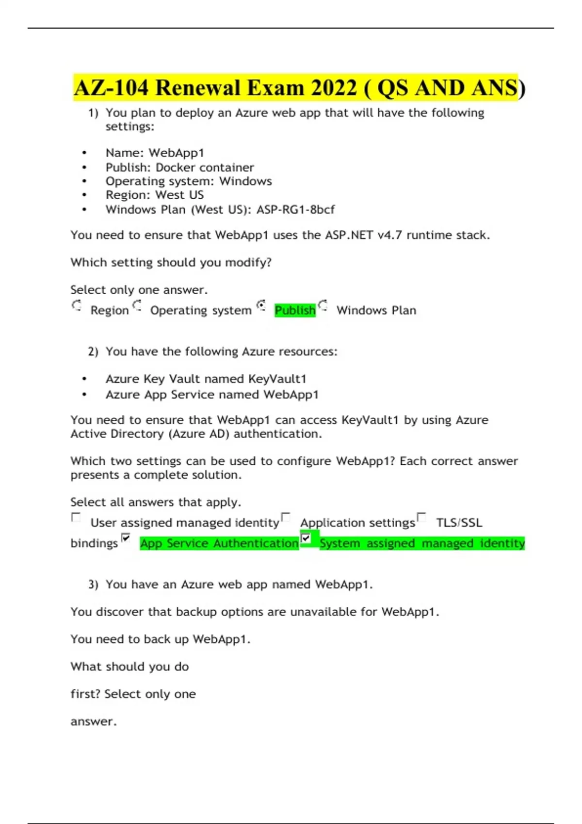 1) You plan to deploy an Azure web app that will have the following settings: • Name: WebApp1 • Publish: Docker container • Operating system: Windows • Region: West US • Windows Plan (West US): ASP-RG1-8bcf You need to ensure that WebApp1 uses the ASP.NET v4.7 runtime stack. Which setting should you modify? Select only one answer. Region Operating system Publish Windows Plan 2) You have the following Azure resources: • Azure Key Vault named KeyVault1 • Azure App Service named WebApp1 You need to ensure that WebApp1 can access KeyVault1 by using Azure Active Directory (Azure AD) authentication. Which two settings can be used to configure WebApp1? Each correct answer presents a complete solution. Select all answers that apply. User assigned managed identity Application settings TLS/SSL bindings App Service Authentication System assigned managed identity 3) You have an Azure web app named WebApp1. You discover that backup options are unavailable for WebApp1. You need to back up WebApp1. What should you do first? Select only one answer. Modify the platform settings of WebApp1. Modify the Application settings of WebApp1. Scale up the app service plan. Scale out the app service plan. 4) You have an Azure web app named Contoso2023. You add a deployment slot to Contoso2023 named Slot1. You need to be able to perform a deployment slot swap with preview. What should you modify? Select only one answer. application settings for Contoso2023 general settings for Contoso2023 application settings for Contoso2023-Slot1 general settings for Contoso2023-Slot1 5) You plan to create an Azure container instance named container1 that will use a Docker image named Image1. You need to ensure that container1 has persistent storage. Which Azure resources should you deploy for the persistent storage? Select only one answer. an Azure container registry only an Azure Storage account and a file share an Azure Storage account and a blob container an Azure SQL database only 6) You have an Azure container registry named Registry1. You enable the admin user for Registry1. Which username should you use to connect to Registry1 as an admin user? Select only one answer. root Admin Administrator Registry1 R 7) You have an Azure subscription that contains the following resources: • a storage account named storage123 • a container instance named AppContainer The subscription contains a virtual network named VirtualNet4 that has the following subnets: • SubnetA- storage123 is connected to SubnetA. • SubnetB- AppContainer is connected to SubnetB. • SubnetC- No resources. You plan to deploy an Azure container instance named container5 to VirtualNet4. To which subnets can you deploy container5? Select only one answer. SubnetB only SubnetC only SubnetB and SubnetC only SubnetA, SubnetB, and SubnetC 8) You have an Azure Storage account named storage1. You create the following encryption scopes for storage1: • Scope1 that has an encryption type of Microsoft-managed keys • Scope2 that has an encryption type of Customer-managed keys Which storage services can be used with Scope2? Select only one answer. blob only file only blob and file only table and queue only blob, file, table, and queue 9) You have an Azure Storage account named storage1 that contains a file share named share1. You also have an on-premises Active Directory domain that contains a user named User1. You need to ensure that User1 can access share1 by using the SMB protocol. What should you do? Select only one answer. Provide User1 with the shared access signature (SAS) for storage1. Configure the Access control (IAM) settings of storage1. Configure the Firewalls and virtual networks settings of storage1. Provide User1 with the access key for storage1. 10) You have an Azure Storage account named storage1 that is configured to use the Hot access tier. Storage1 has a container named container1 and the lifecycle management rule with following settings: • Move blob to cool storage: Selected o Days after last modification: 3 • Move blob to archive storage: Selected o Days after last modification: 5 On December 1, you create a file named File1 in container1. On December 10, you rehydrate File1 and move the file to the Hot access tier. When will File1 be moved to archive storage? Select only one answer. within 24 hours on December 15 on December 18 on January 1 11) You have an Azure Storage account named storage1. You need to provide time-limited access to storage1. What should you use? Select only one answer. an access key a role assignment an access policy a shared access signature (SAS) 12) You have the following Azure virtual machines that run Windows Server 2019: • Server1- connected to VirtualNET1 and has a W DNS suffix configured in Windows Server 2019 • Server2- connected to VirtualNET1 and has a F DNS suffix configured in Windows Server 2019 • Server3- connected to VirtualNET2 and has a W DNS suffix configured in Windows Server 2019 • Server4- connected to VirtualNET2 and has a F DNS suffix