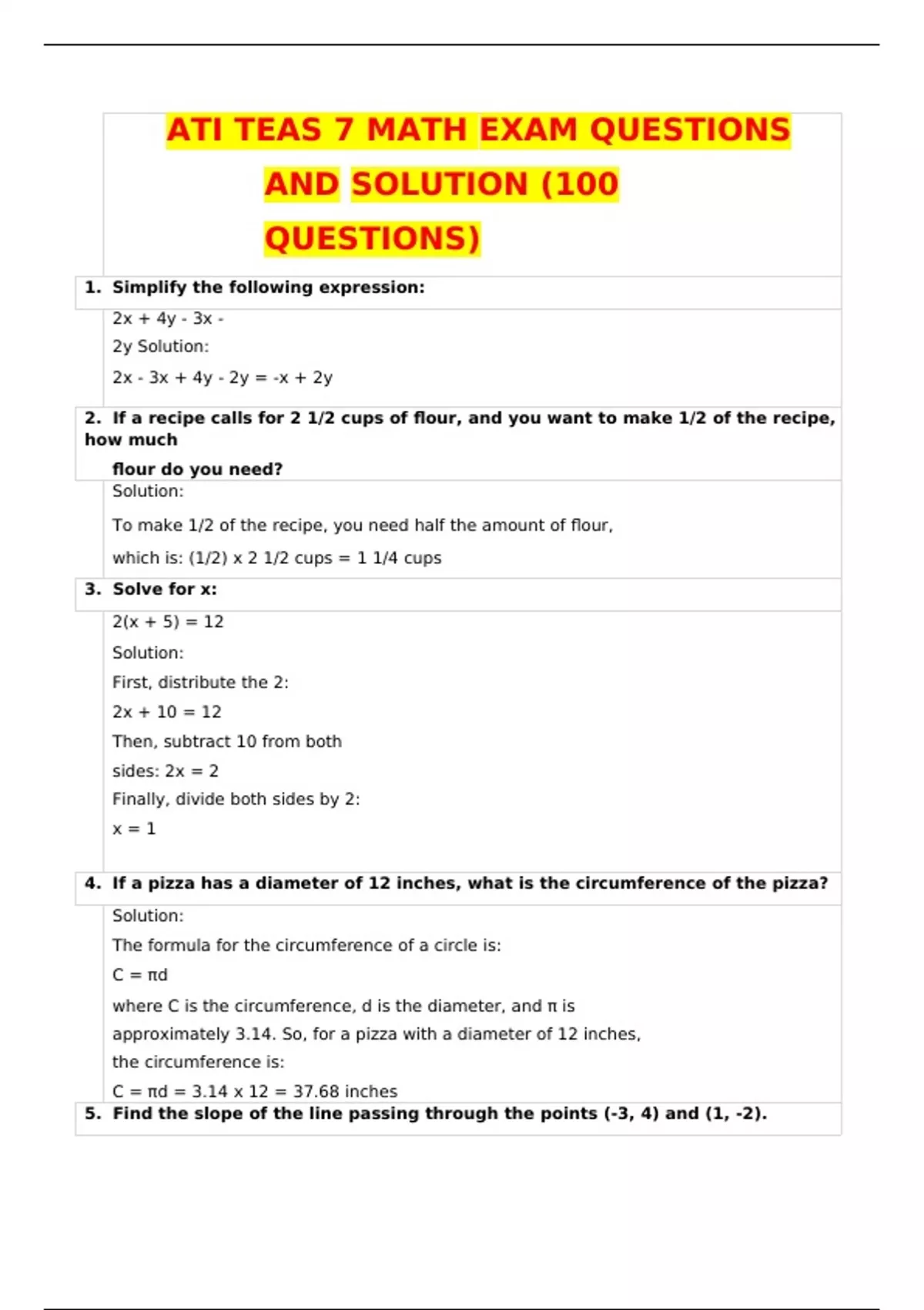 LATEST ATI TEAS 7 MATH EXAM QUESTIONS AND SOLUTION (100+ QUESTIONS)