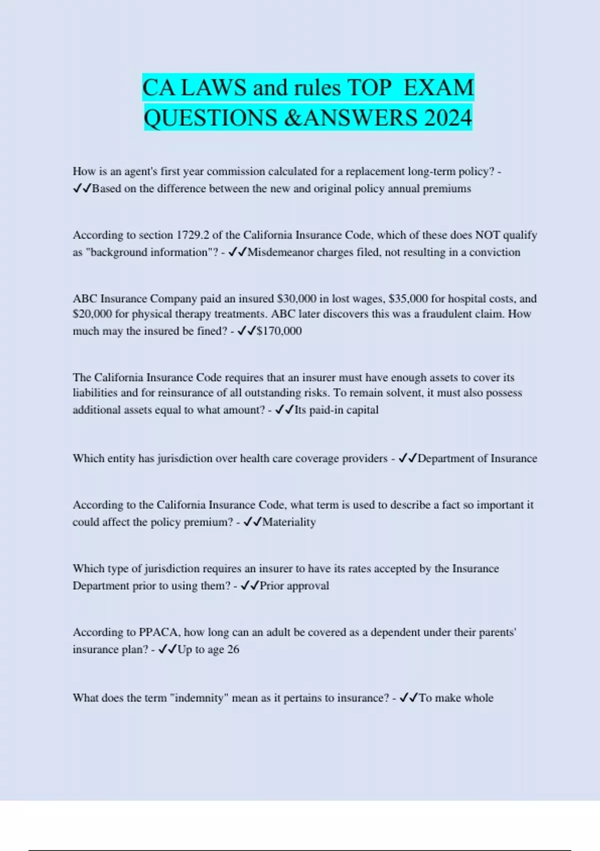 How is an agent's first year commission calculated for a replacement long-term policy? - Based on the difference between the new and original policy annual premiums According to section 1729.2 of the California Insurance Code, which of these does NOT qualify as "background information"? - Misdemeanor charges filed, not resulting in a conviction ABC Insurance Company paid an insured $30,000 in lost wages, $35,000 for hospital costs, and $20,000 for physical therapy treatments. ABC later discovers this was a fraudulent claim. How much may the insured be fined? - $170,000 The California Insurance Code requires that an insurer must have enough assets to cover its liabilities and for reinsurance of all outstanding risks. To remain solvent, it must also possess additional assets equal to what amount? - Its paid-in capital Which entity has jurisdiction over health care coverage providers - Department of Insurance According to the California Insurance Code, what term is used to describe a fact so important it could affect the policy premium? - Materiality Which type of jurisdiction requires an insurer to have its rates accepted by the Insurance Department prior to using them? - Prior approval