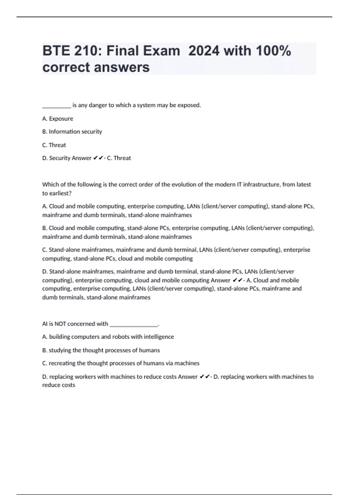 _________ is any danger to which a system may be exposed. A. Exposure B. Information security C. Threat D. Security Answer - C. Threat Which of the following is the correct order of the evolution of the modern IT infrastructure, from latest to earliest? A. Cloud and mobile computing, enterprise computing, LANs (client/server computing), stand-alone PCs, mainframe and dumb terminals, stand-alone mainframes B. Cloud and mobile computing, stand-alone PCs, enterprise computing, LANs (client/server computing), mainframe and dumb terminals, stand-alone mainframes C. Stand-alone mainframes, mainframe and dumb terminal, LANs (client/server computing), enterprise computing, stand-alone PCs, cloud and mobile computing D. Stand-alone mainframes, mainframe and dumb terminal, stand-alone PCs, LANs (client/server computing), enterprise computing, cloud and mobile computing Answer - A. Cloud and mobile computing, enterprise computing, LANs (client/server computing), stand-alone PCs, mainframe and dumb terminals, stand-alone mainframes AI is NOT concerned with _______________. A. building computers and robots with intelligence B. studying the thought processes of humans C. recreating the thought processes of humans via machines D. replacing workers with machines to reduce costs Answer - D. replacing workers with machines to reduce costs ___________________ are often populated with data from source data automation technologies such as bar code scanners. A. DSS B. ERP C. FAIS D. TPS Answer - D. TPS H is a type of ______________ CRM system. A. analytical B. operational, customer-facing C. operational, customer-touching D. analytical and operational Answer - C. operational, customer-touching ____________ is NOT categorized as BI. A. Applications B. Hardware C. Processes D. Technologies Answer - B. Hardware _________ is the possibility that the system will be harmed by a threat. A. Exposure B. Threat C. Security D. Vulnerability Answer - D. Vulnerability Which of the following is NOT a requirement of TPSs? A. Have to efficiently handle large variations in volumes of data B. Must maximize downtime C. Must ensure overlapping updates can't occur D. Mus