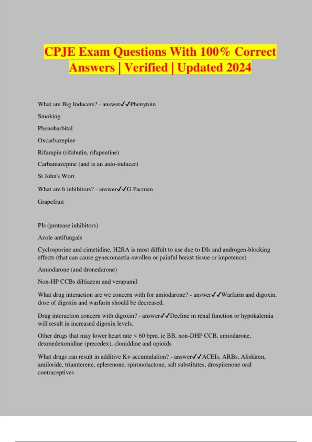CPJE Exam Questions With 100% Correct Answers | Verified | Updated 2024 What are Big Inducers? - answerPhenytoin Smoking Phenobarbital Oxcarbazepine Rifampin (rifabutin, rifapentine) Carbamazepine (and is an auto-inducer) St John's Wort What are b inhibitors? - answerG Pacman Grapefruit PIs (protease inhibitors) Azole antifungals Cyclosporine and cimetidine, H2RA is most diffult to use due to DIs and androgen-blocking effects (that can cause gynecomastia-swollen or painful breast tissue or impotence) Amiodarone (and dronedarone) Non-HP CCBs diltiazem and verapamil What drug interaction are we concern with for amiodarone? - answerWarfarin and digoxin. dose of digoxin and warfarin should be decreased. Drug interaction concern with digoxin? - answerDecline in renal function or hypokalemia will result in increased digoxin levels. Other drugs that may lower heart rate < 60 bpm. ie BB, non-DHP CCB, amiodarone, dexmedetomidine (precedex), cloniddine and opioids What drugs can result in additive K+ accumulation? - answerACEIs, ARBs, Aliskiren, amiloride, triamterene, eplerenone, spironolactone, salt substitutes, drospirenone oral contraceptives Bactrim, Calcineurin inhibitors, canglifozin What are side effects of Tamiflu? - answerHallucination, confusion, and strange behavior in children What is the common side effect of opioids? - answerThey can cause histamine-induced skin rash or itching. Reaction can be reduced via pre-medication with an antihistamine What drugs are commonly associated with photosensitivity? - answerSulfa Abx Tetracycline NSAIDs Amiodarone Chloroquine Coal Tar Oral and topical retinoids phenothiazines psoralens Quinidine FQ Tacrolimus Diuretics, thiazide, loops Topical 5-fu Metronidazole St John's WortPDE-5 inhibitors Cyclosporine Drugs for SJS/TEN? - answerSulfamethoxa