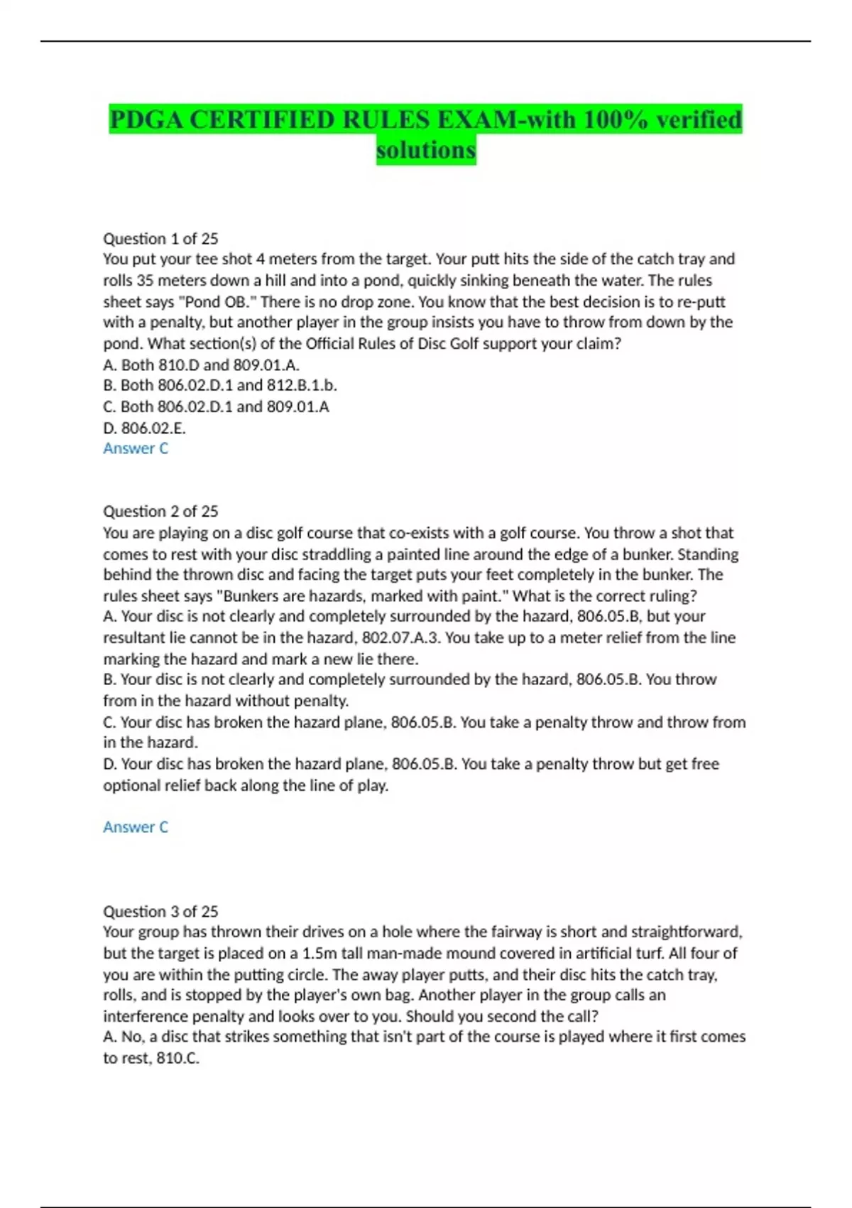 PDGA CERTIFIED RULES EXAM-with 100% verified solutions