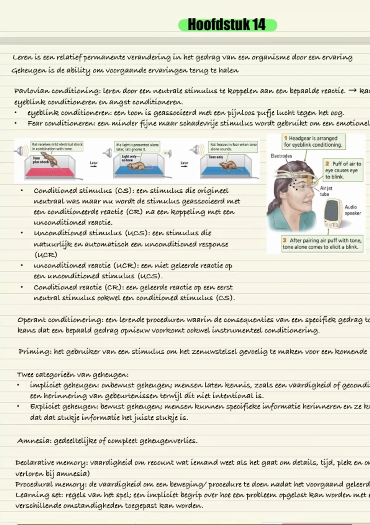 • eyeblink conditioneren: een toon is geassocieerd met een pijnloos pufje lucht tegen het oog.
