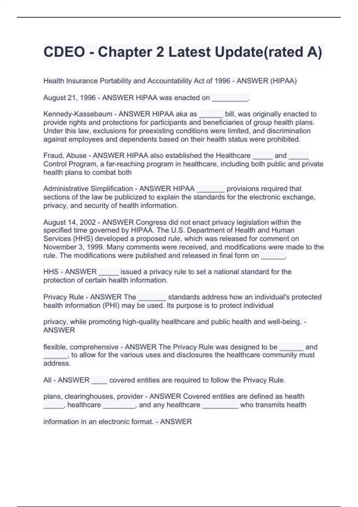 CDEO - Chapter 2 Latest Update(rated A) Health Insurance Portability and Accountability Act of 1996 - ANSWER (HIPAA) August 21, 1996 - ANSWER HIPAA was enacted on _________. Kennedy-Kassebaum - ANSWER HIPAA aka as ______ bill, was originally enacted to provide rights and protections for participants and beneficiaries of group health plans. Under this law, exclusions for preexisting conditions were limited, and discrimination against employees and dependents based on their health status were prohibited. Fraud, Abuse - ANSWER HIPAA also established the Healthcare _____ and _____ Control Program, a far-reaching program in healthcare, including both public and private health plans to combat both Administrative Simplification - ANSWER HIPAA _______ provisions required that sections of the law be publicized to explain the standards for the electronic exchange, privacy, and security of health information. August 14, 2002 - ANSWER Congress did not enact privacy legislation within the specified time governed by HIPAA. The U.S. Department of Health and Human Services (HHS) developed a proposed rule, which was released for comment on November 3, 1999. Many comments were received, and modifications were made to the rule. The modifications were published and released in final form on ______. HHS - ANSWER _____ issued a privacy rule to set a national standard for the protection of certain health information. Privacy Rule - ANSWER The _______ standards address how an individual's protected health information (PHI) may be used. Its purpose is to protect individual privacy, while promoting high-quality healthcare and public health and well-being. - ANSWER flexible, comprehensive - ANSWER The Privacy Rule was designed to be ______ and ______, to allow for the various uses and disclosures the healthcare community must address. All - ANSWER ____ covered entities are required to follow the Privacy Rule. plans, clearinghouses, provider - ANSWER Covered entities are defined as health _____, healthcare ________, and any healthcare _________ who transmits health information in an electronic format. - ANSWER plan - ANSWER Health ______ covered entities are organizations that pay providers on behalf of an individual receiving medical care. These plans include health, dental, vision, and prescription drug insurers. Some examples include health maintenance organizations (HMOs), Medicare, Medicaid, and Medicare supplement insurers, as well as employer, government, and church-sponsored group health plans. There are exceptions: An employer who solely establishes and maintains the plan with fewer than 50 participants is exempt. Two types of government-funded programs - ANSWER are not health plans: food stamps and community health centers. Insurers providing only worker's compensation, automobile insurance, and property and casualty insurance are not considered to be health plans. - ANSWER providers - ANSWER All healthcare ________ who electronically transmit health information through certain transactions are covered entities. Some examples of transactions that may be submitted electronically are claim forms, inquiries about the eligibility of benefits, and requests for authorization of referrals. Simply using electronic technology, such as sending emails, does not mean a healthcare provider is a covered entity; the transmission must be in connection with a standard transaction. The rule applies to all, regardless of whether they transmit the transactions directly, or use a billing service or other third party to transmit on their behalf. They are defined as providers of services, such as hospitals, and providers of medical or health services, such as physicians, dentists, and other practitioners who furnish, bill, or receive payment for healthcare. clearinghouses - ANSWER Healthcare ________ include billing services, repricing companies, and community health management information systems that process nonstandard information, received from another entity, into a standard (ie, standard format or data content) or vice versa. In most instances, healthcare clearinghouses receive individually identifiable information for processing services to a health plan or healthcare provider as a business associate. In these cases, only certain provisions are applicable to the clearinghouses' uses and disclosures of protected health information. Transactions - ANSWER _______ occur through electronic exchanges, which allow information to be transferred between two parties for specific purposes. plan - ANSWER A healthcare provider will send a claim to a health _____ to request payment for the medical services he or she provides. HIPAA - ANSWER _____ regulations standardized transactions for Electronic Data Interchange (EDI) of healthcare data. These transactions are: claims and encounter information, payment and remittance advice, claims status, eligibility, enrollment and disenrollment, referrals and authorizations, coordination of benefits, and premium payment.