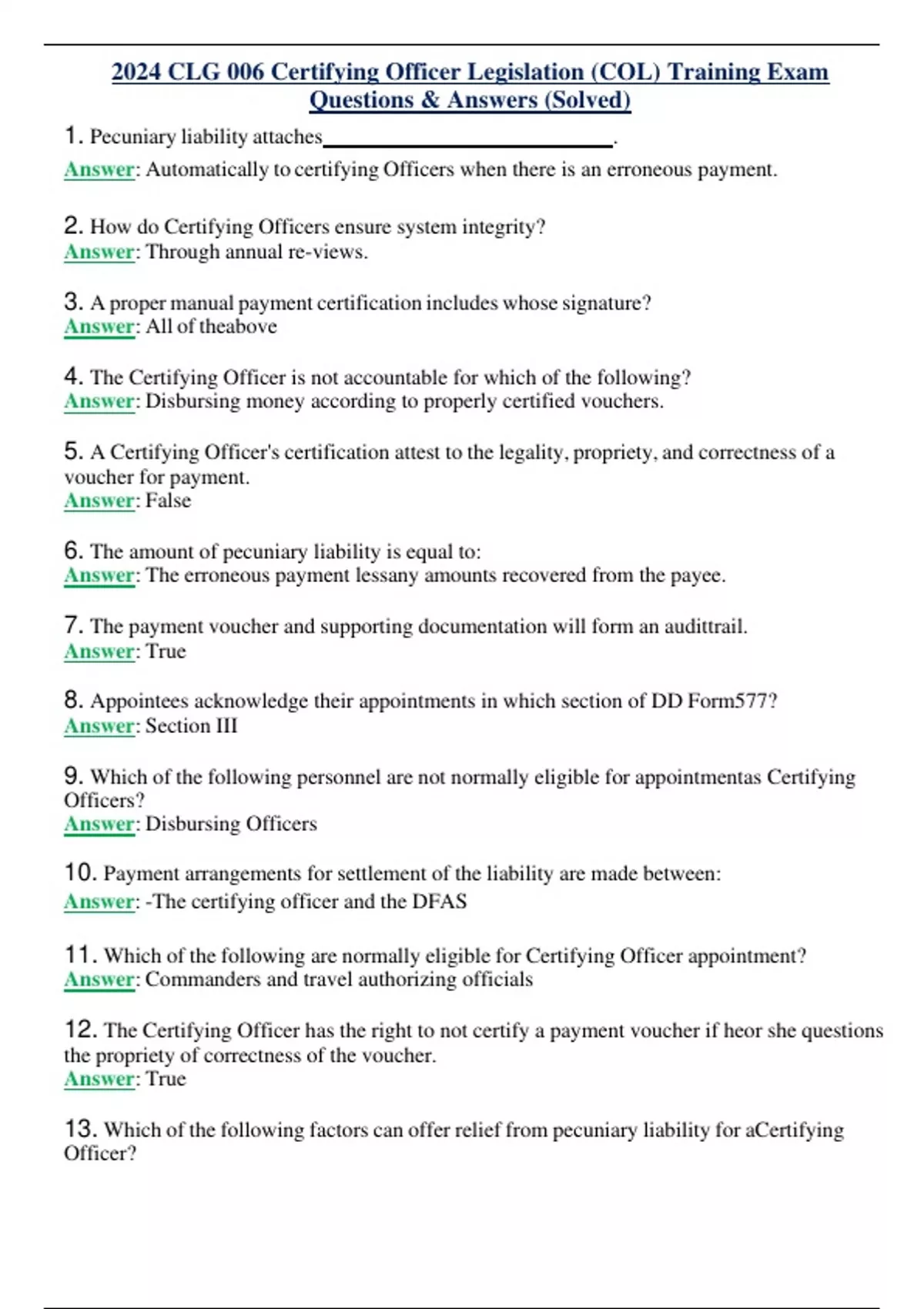 2024 CLG 006 Certifying Officer Legislation (COL) Training Exam Questions & Answers (Solved) 1. Pecuniary liability attaches . Answer: Automatically to certifying Officers when there is an erroneous payment. 2. How do Certifying Officers ensure system integrity? Answer: Through annual re-views. 3. A proper manual payment certification includes whose signature? Answer: All of theabove 4. The Certifying Officer is not accountable for which of the following? Answer: Disbursing money according to properly certified vouchers. 5. A Certifying Officer's certification attest to the legality, propriety, and correctness of a voucher for payment. Answer: False 6. The amount of pecuniary liability is equal to: Answer: The erroneous payment lessany amounts recovered from the payee. 7. The payment voucher and supporting documentation will form an audittrail. Answer: True 8. Appointees acknowledge their appointments in which section of DD Form577? Answer: Section III 9. Which of the following personnel are not normally eligible for appointmentas Certifying Officers? Answer: Disbursing Officers 10. Payment arrangements for settlement of the liability are made between: Answer: -The certifying officer and the DFAS 11. Which of the following are normally eligible for Certifying Officer appointment? Answer: Commanders and travel authorizing officials 12. The Certifying Officer has the right to not certify a payment voucher if heor she questions the propriety of correctness of the voucher. Answer: True 13. Which of the following factors can offer relief from pecuniary liability for aCertifying Officer? Answer: Full recovery of erroneous payment
