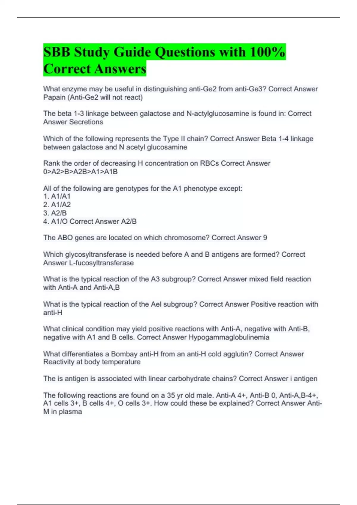 What enzyme may be useful in distinguishing anti-Ge2 from anti-Ge3? Correct Answer Papain (Anti-Ge2 will not react) The beta 1-3 linkage between galactose and N-actylglucosamine is found in: Correct Answer Secretions Which of the following represents the Type II chain? Correct Answer Beta 1-4 linkage between galactose and N acetyl glucosamine Rank the order of decreasing H concentration on RBCs Correct Answer 0>A2>B>A2B>A1>A1B All of the following are genotypes for the A1 phenotype except: 1. A1/A1 2. A1/A2 3. A2/B 4. A1/O Correct Answer A2/B The ABO genes are located on which chromosome? Correct Answer 9 Which glycosyltransferase is needed before A and B antigens are formed? Correct Answer L-fucosyltransferase What is the typical reaction of the A3 subgroup? Correct Answer mixed field reaction with Anti-A and Anti-A,B What is the typical reaction of the Ael subgroup? Correct Answer Positive reaction with anti-H What clinical condition may yield positive reactions with Anti-A, negative with Anti-B, negative with A1 and B cells. Correct Answer Hypogammaglobulinemia What differentiates a Bombay anti-H from an anti-H cold agglutin? Correct Answer Reactivity at body temperature The is antigen is associated with linear carbohydrate chains? Correct Answer i antigen The following reactions are found on a 35 yr old male. Anti-A 4+, Anti-B 0, Anti-A,B-4+, A1 cells 3+, B cells 4+, O cells 3+. How could these be explained? Correct Answer Anti-M in plasma