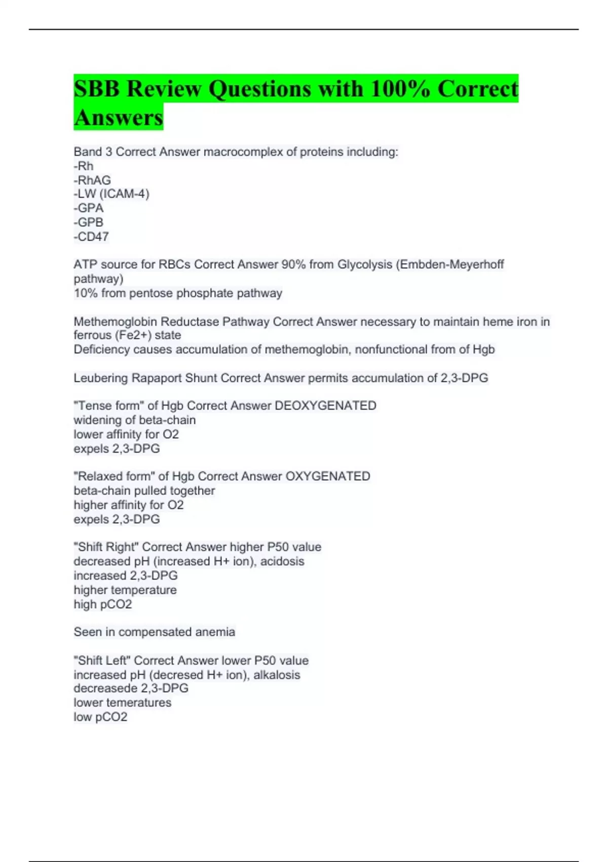 Band 3 Correct Answer macrocomplex of proteins including: -Rh -RhAG -LW (ICAM-4) -GPA -GPB -CD47 ATP source for RBCs Correct Answer 90% from Glycolysis (Embden-Meyerhoff pathway) 10% from pentose phosphate pathway Methemoglobin Reductase Pathway Correct Answer necessary to maintain heme iron in ferrous (Fe2+) state Deficiency causes accumulation of methemoglobin, nonfunctional from of Hgb Leubering Rapaport Shunt Correct Answer permits accumulation of 2,3-DPG "Tense form" of Hgb Correct Answer DEOXYGENATED widening of beta-chain lower affinity for O2 expels 2,3-DPG "Relaxed form" of Hgb Correct Answer OXYGENATED beta-chain pulled together higher affinity for O2 expels 2,3-DPG "Shift Right" Correct Answer higher P50 value decreased pH (increased H+ ion), acidosis increased 2,3-DPG higher temperature high pCO2 Seen in compensated anemia "Shift Left" Correct Answer lower P50 value increased pH (decresed H+ ion), alkalosis decreasede 2,3-DPG lower temeratures low pCO2 Seen in storage of RBC Type 2 precursor Correct Answer Gal-GlcNAc B1-4 Type 1 precursor Correct Answer Gal-GlcNAc B1-3 Secreted (Se, Le) Type 2 H antigen transeferase & Sugar Correct Answer FUT-1 Alpha-2-L-fucosyltransferase Fuctose alpha1-2 A antigen transferase & sugar Correct Answer D-galactosaminetrasferase N-acetylgalactosamine alpha1-3 B antigen transferase & sugar Correct Answer D-galacotsyltransferase galactose alpha1-3 Ax subgroup Correct Answer weakly positive anti-A weakly positive anti-A,B Am subgroup Correct Answer Negative anti-A Secretes A & H Ael subgroup Correct Answer Negative anti-A Secretes H only Highest expression of H Lowest expression of H Correct Answer O>A2>B>A2B>A1>A1B> H deficient Lewis transferase & Sugar Correct Answer FUT-3 Fuctose alpha1-4 Type 1 H antigen transferase & sugar Correct Answer FUT-2 Fuctose alpha1-2 anti-Le bh vs anti-Le bl Correct Answer Anti-Le bh= reacts best with Leb & H are on rbc