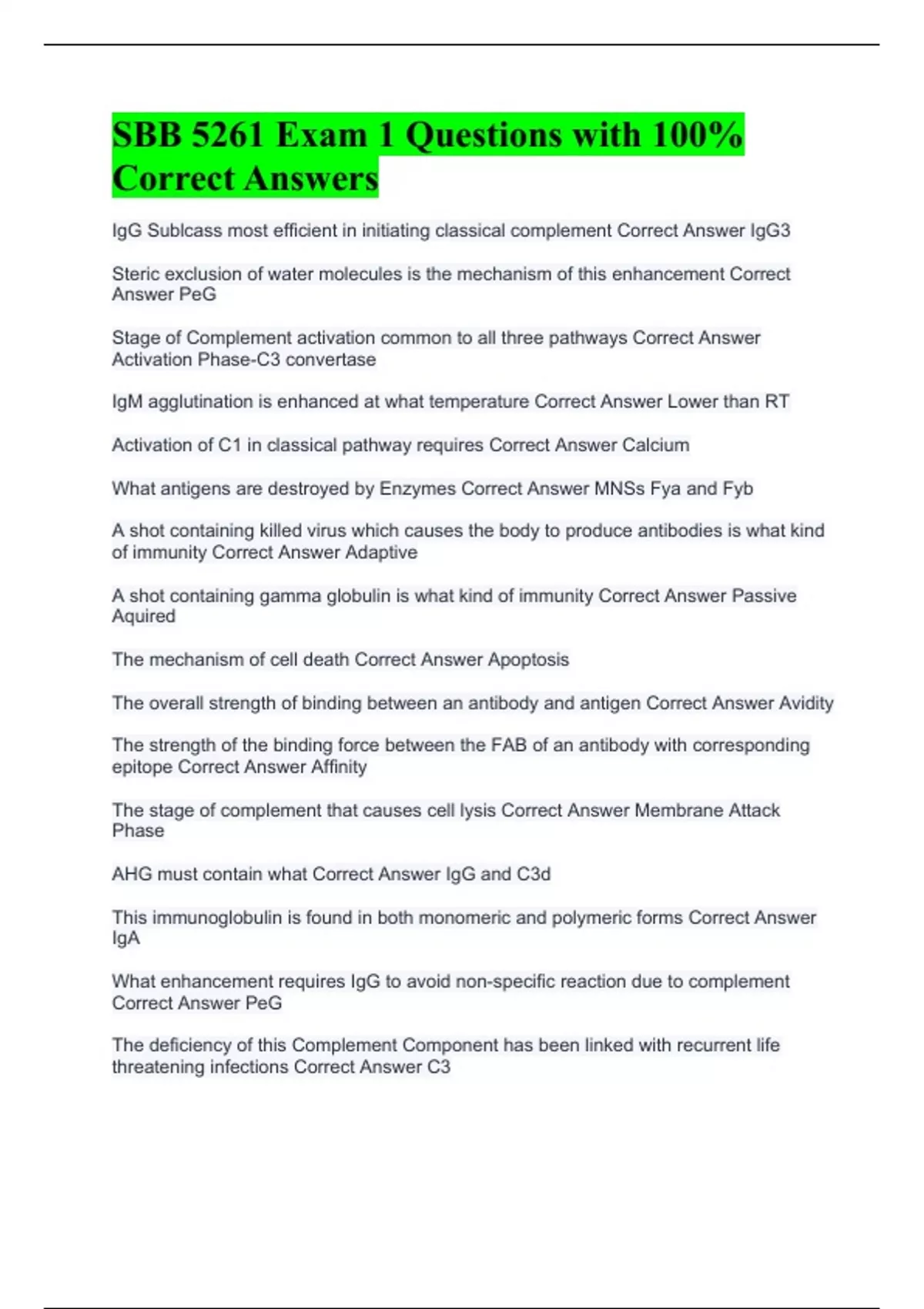 IgG Sublcass most efficient in initiating classical complement Correct Answer IgG3 Steric exclusion of water molecules is the mechanism of this enhancement Correct Answer PeG Stage of Complement activation common to all three pathways Correct Answer Activation Phase-C3 convertase IgM agglutination is enhanced at what temperature Correct Answer Lower than RT Activation of C1 in classical pathway requires Correct Answer Calcium What antigens are destroyed by Enzymes Correct Answer MNSs Fya and Fyb A shot containing killed virus which causes the body to produce antibodies is what kind of immunity Correct Answer Adaptive A shot containing gamma globulin is what kind of immunity Correct Answer Passive Aquired The mechanism of cell death Correct Answer Apoptosis The overall strength of binding between an antibody and antigen Correct Answer Avidity The strength of the binding force between the FAB of an antibody with corresponding epitope Correct Answer Affinity The stage of complement that causes cell lysis Correct Answer Membrane Attack Phase AHG must contain what Correct Answer IgG and C3d This immunoglobulin is found in both monomeric and polymeric forms Correct Answer IgA What enhancement requires IgG to avoid non-specific reaction due to complement Correct Answer PeG The deficiency of this Complement Component has been linked with recurrent life threatening infections Correct Answer C3