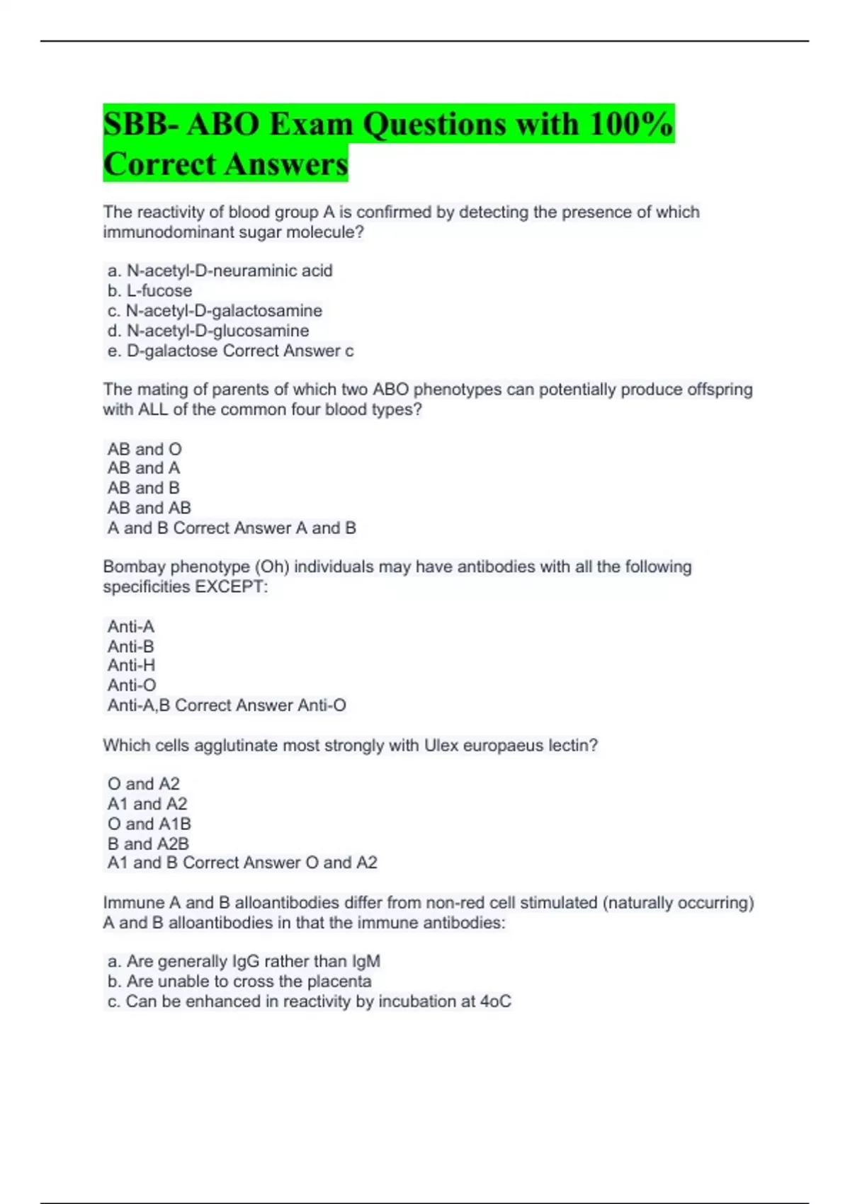 The reactivity of blood group A is confirmed by detecting the presence of which immunodominant sugar molecule? a. N-acetyl-D-neuraminic acid b. L-fucose c. N-acetyl-D-galactosamine d. N-acetyl-D-glucosamine e. D-galactose Correct Answer c The mating of parents of which two ABO phenotypes can potentially produce offspring with ALL of the common four blood types? AB and O AB and A AB and B AB and AB A and B Correct Answer A and B Bombay phenotype (Oh) individuals may have antibodies with all the following specificities EXCEPT: Anti-A Anti-B Anti-H Anti-O Anti-A,B Correct Answer Anti-O Which cells agglutinate most strongly with Ulex europaeus lectin? O and A2 A1 and A2 O and A1B B and A2B A1 and B Correct Answer O and A2 Immune A and B alloantibodies differ from non-red cell stimulated (naturally occurring) A and B alloantibodies in that the immune antibodies: a. Are generally IgG rather than IgM b. Are unable to cross the placenta c. Can be enhanced in reactivity by incubation at 4oC