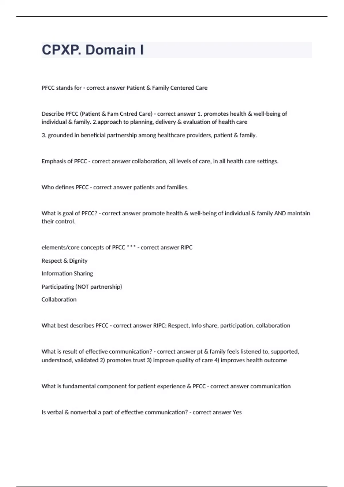 CPXP. Domain I Question and answers correctly solved 2023/2024 PFCC stands for - correct answer Patient & Family Centered Care Describe PFCC (Patient & Fam Cntred Care) - correct answer 1. promotes health & well-being of individual & family. ach to planning, delivery & evaluation of health care 3. grounded in beneficial partnership among healthcare providers, patient & family. Emphasis of PFCC - correct answer collaboration, all levels of care, in all health care settings. Who defines PFCC - correct answer patients and families. What is goal of PFCC? - correct answer promote health & well-being of individual & family AND maintain their control. elements/core concepts of PFCC *** - correct answer RIPC Respect & Dignity Information Sharing Participating (NOT partnership) Collaboration