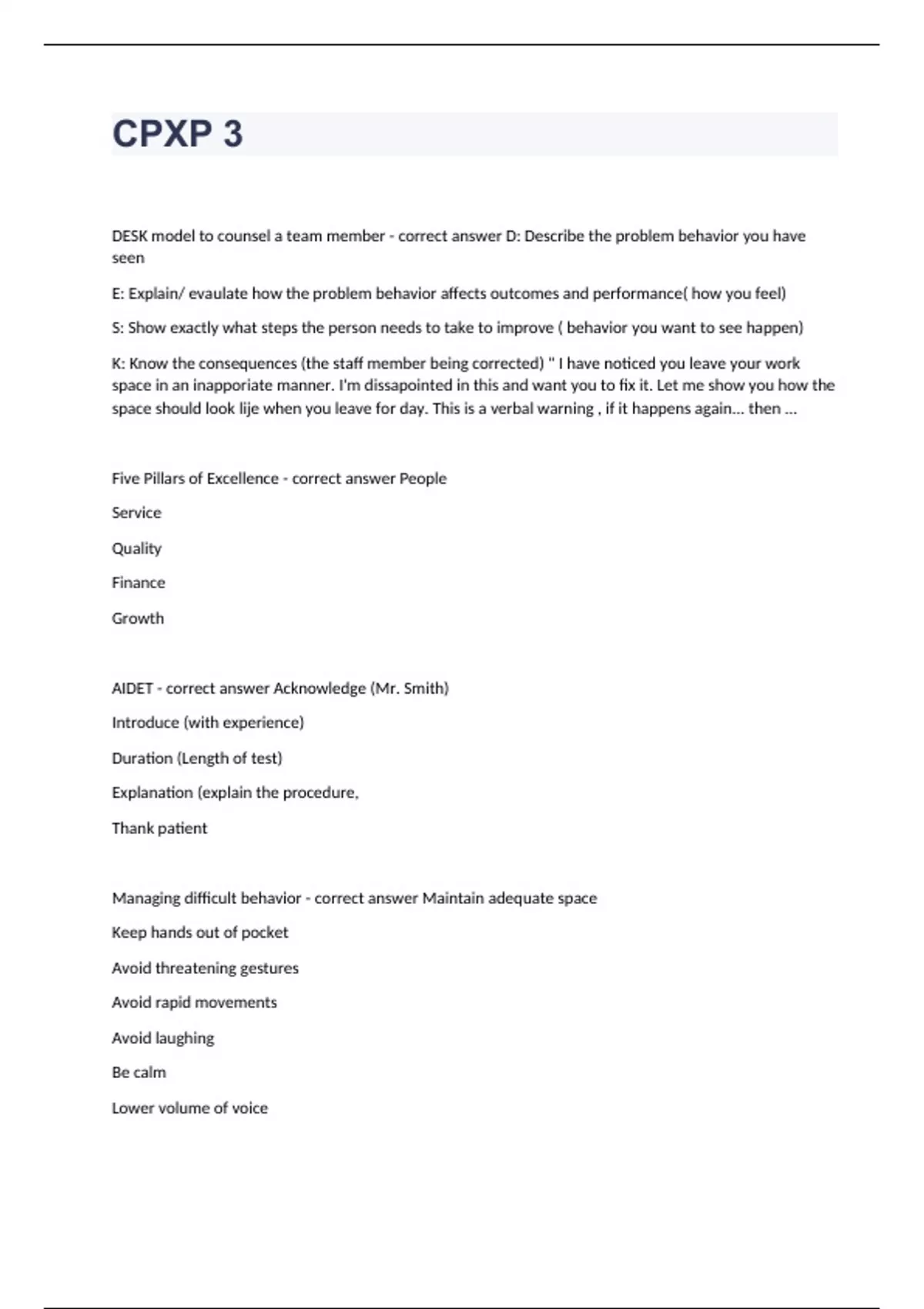 CPXP 3 Question and answers correctly solved 2023/2024DESK model to counsel a team member - correct answer D: Describe the problem behavior you have seen E: Explain/ evaulate how the problem behavior affects outcomes and performance( how you feel) S: Show exactly what steps the person needs to take to improve ( behavior you want to see happen) K: Know the consequences (the staff member being corrected) " I have noticed you leave your work space in an inapporiate manner. I'm dissapointed in this and want you to fix it. Let me show you how the space should look lije when you leave for day. This is a verbal warning , if it happens again... then ... Five Pillars of Excellence - correct answer People Service Quality Finance Growth AIDET - correct answer Acknowledge (Mr. Smith) Introduce (with experience) Duration (Length of test) Explanation (explain the procedure, Thank patient Managing difficult behavior - correct answer Maintain adequate space Keep hands out of pocket Avoid threatening gesture
