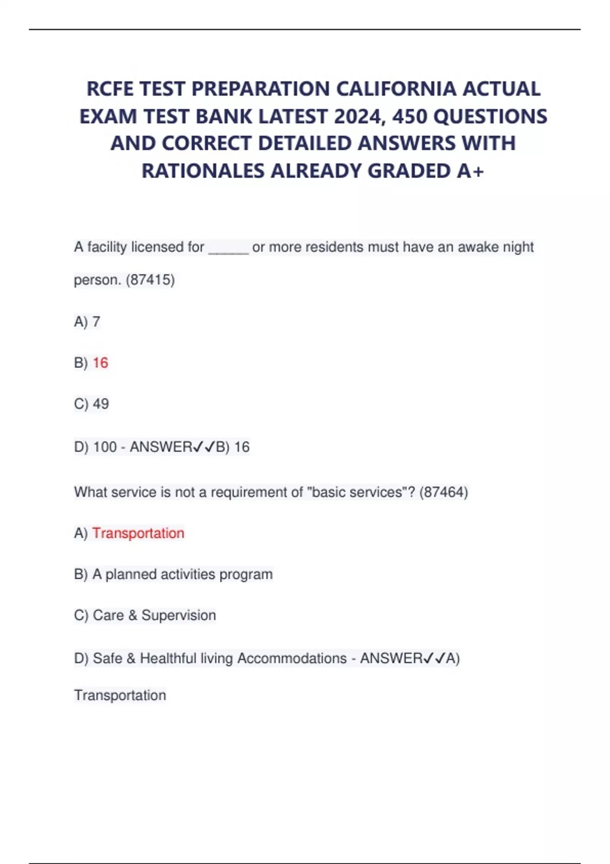 RCFE TEST PREPARATION CALIFORNIA ACTUAL EXAM TEST BANK LATEST 2024, 450 QUESTIONS AND CORRECT DETAILED ANSWERS WITH RATIONALES ALREADY GRADED A+