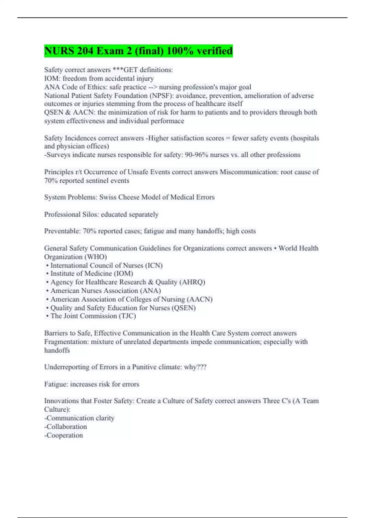 Safety correct answers ***GET definitions: IOM: freedom from accidental injury ANA Code of Ethics: safe practice --> nursing profession's major goal National Patient Safety Foundation (NPSF): avoidance, prevention, amelioration of adverse outcomes or injuries stemming from the process of healthcare itself QSEN & AACN: the minimization of risk for harm to patients and to providers through both system effectiveness and individual performace Safety Incidences correct answers -Higher satisfaction scores = fewer safety events (hospitals and physician offices) -Surveys indicate nurses responsible for safety: 90-96% nurses vs. all other professions Principles r/t Occurrence of Unsafe Events correct answers Miscommunication: root cause of 70% reported sentinel events System Problems: Swiss Cheese Model of Medical Errors Professional Silos: educated separately Preventable: 70% reported cases; fatigue and many handoffs; high costs General Safety Communication Guidelines for Organizations correct answers • World Health Organization (WHO) • International Council of Nurses (ICN) • Institute of Medicine (IOM) • Agency for Healthcare Research & Quality (AHRQ) • American Nurses Association (ANA) • American Association of Colleges of Nursing (AACN) • Quality and Safety Education for Nurses (QSEN) • The Joint Commission (TJC) Barriers to Safe, Effective Communication in the Health Care System correct answers Fragmentation: mixture of unrelated departments impede communication; especially with handoffs Underreporting of Errors in a Punitive climate: why??? Fatigue: increases risk for errors Innovations that Foster Safety: Create a Culture of Safety correct answers Three C's (A Team Culture): -Communication clarity -Collaboration -Cooperation