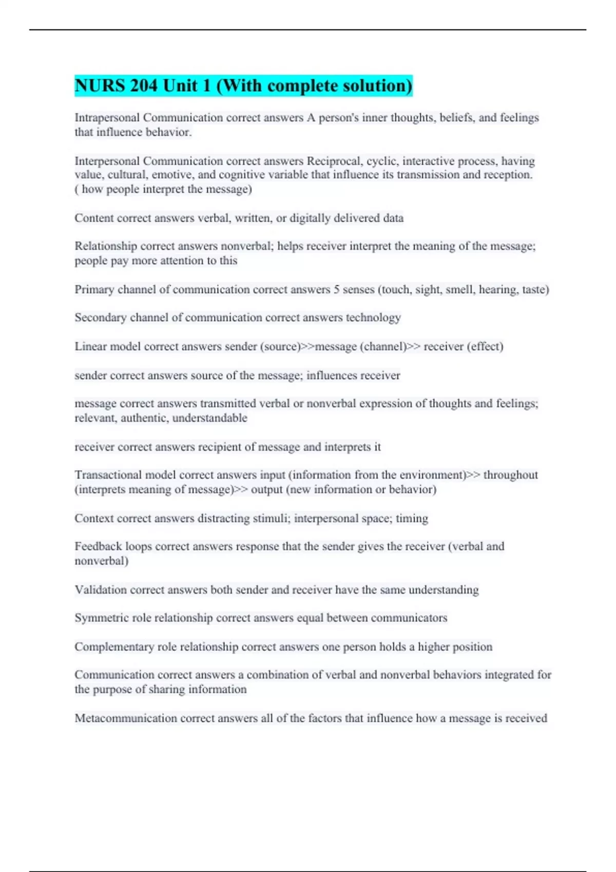 Intrapersonal Communication correct answers A person's inner thoughts, beliefs, and feelings that influence behavior. Interpersonal Communication correct answers Reciprocal, cyclic, interactive process, having value, cultural, emotive, and cognitive variable that influence its transmission and reception. ( how people interpret the message) Content correct answers verbal, written, or digitally delivered data Relationship correct answers nonverbal; helps receiver interpret the meaning of the message; people pay more attention to this Primary channel of communication correct answers 5 senses (touch, sight, smell, hearing, taste) Secondary channel of communication correct answers technology Linear model correct answers sender (source)>>message (channel)>> receiver (effect) sender correct answers source of the message; influences receiver message correct answers transmitted verbal or nonverbal expression of thoughts and feelings; relevant, authentic, understandable receiver correct answers recipient of message and interprets it Transactional model correct answers input (information from the environment)>> throughout (interprets meaning of message)>> output (new information or behavior) Context correct answers distracting stimuli; interpersonal space; timing Feedback loops correct answers response that the sender gives the receiver (verbal and nonverbal) Validation correct answers both sender and receiver have the same understanding Symmetric role relationship correct answers equal between communicators Complementary role relationship correct answers one person holds a higher position Communication correct answers a combination of verbal and nonverbal behaviors integrated for the purpose of sharing information Metacommunication correct answers all of the factors that influence how a message is received