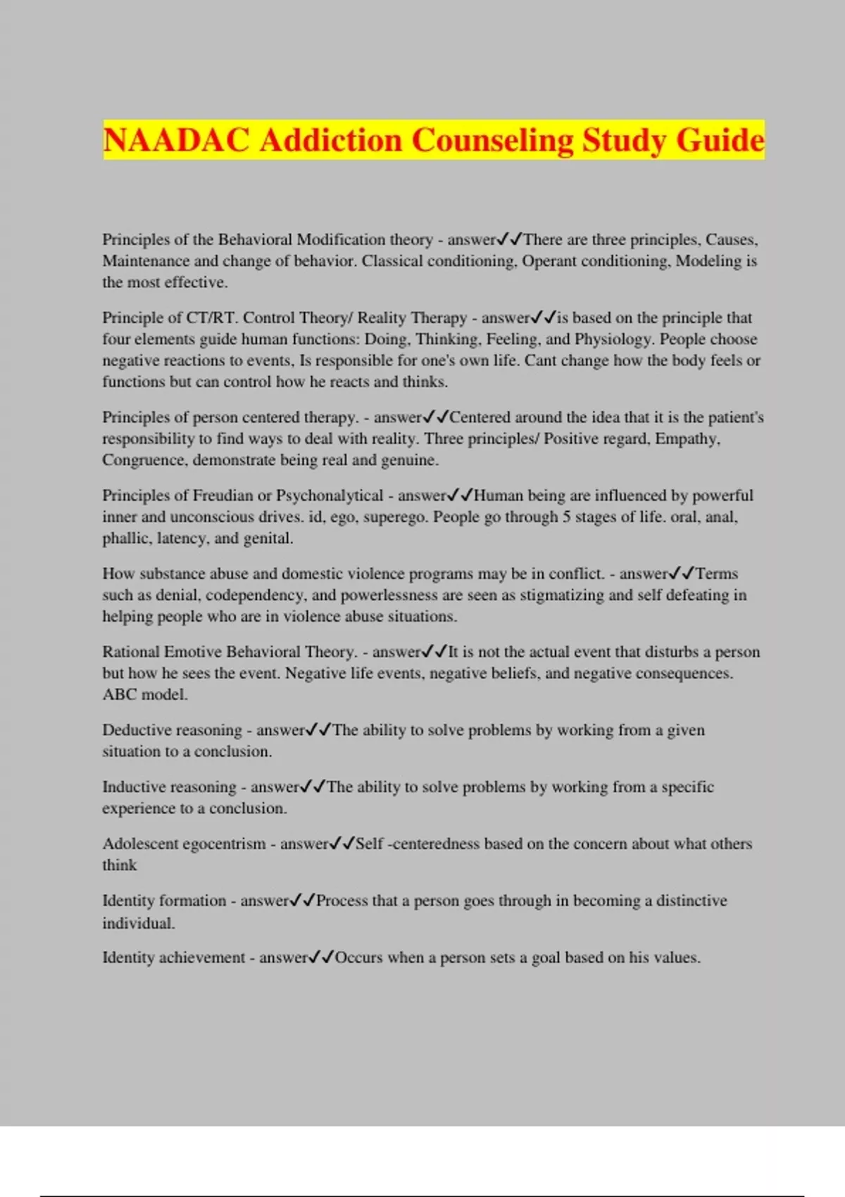 NAADAC Addiction Counseling Study Guide Principles of the Behavioral Modification theory - answerThere are three principles, Causes, Maintenance and change of behavior. Classical conditioning, Operant conditioning, Modeling is the most effective. Principle of CT/RT. Control Theory/ Reality Therapy - answeris based on the principle that four elements guide human functions: Doing, Thinking, Feeling, and Physiology. People choose negative reactions to events, Is responsible for one's own life. Cant change how the body feels or functions but can control how he reacts and thinks. Principles of person centered therapy. - answerCentered around the idea that it is the patient's responsibility to find ways to deal with reality. Three principles/ Positive regard, Empathy, Congruence, demonstrate being real and genuine. Principles of Freudian or Psychonalytical - answerHuman being are influenced by powerful inner and unconscious drives. id, ego, superego. People go through 5 stages of life. oral, anal, phallic, latency, and genital. How substance abuse and domestic violence programs may be in conflict. - answerTerms such as denial, codependency, and powerlessness are seen as stigmatizing and self defeating in helping people who are in violence abuse situations. Rational Emotive Behavioral Theory. - answerIt is not the actual event that disturbs a person but how he sees the event. Negative life events, negative beliefs, and negative consequences. ABC model. Deductive reasoning - answerThe ability to solve problems by working from a given situation to a conclusion. Inductive reasoning - answerThe ability to solve problems by working from a specific experience to a conclusion. Adolescent egocentrism - answerSelf -centeredness based on the concern about what others think Identity formation - answerProcess that a person goes through in becoming a distinctive individual. Identity achievement - answerOccurs when a person sets a goal based on his values. Pharmacotherapies in treatment of substance abuse - answerMeans using prescription drugs along with some form of therapy to treat substance abuse. Benzodiazepines and anti-seizure medicines are aids for this, and methadone for treatment of heroin. Family Systems and addiction counseling -