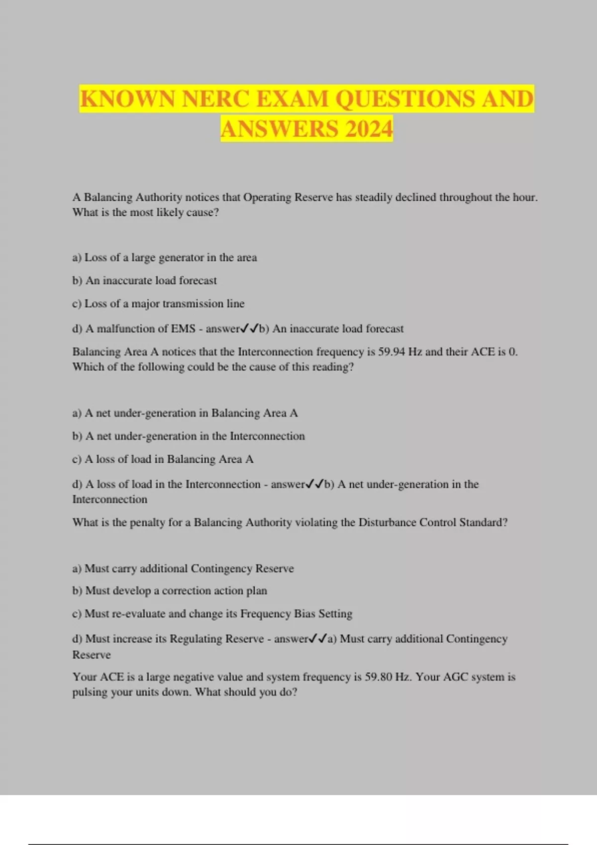 KNOWN NERC EXAM QUESTIONS AND ANSWERS 2024 A Balancing Authority notices that Operating Reserve has steadily declined throughout the hour. What is the most likely cause? a) Loss of a large generator in the area b) An inaccurate load forecast c) Loss of a major transmission line d) A malfunction of EMS - answerb) An inaccurate load forecast Balancing Area A notices that the Interconnection frequency is 59.94 Hz and their ACE is 0. Which of the following could be the cause of this reading? a) A net under-generation in Balancing Area A b) A net under-generation in the Interconnection c) A loss of load in Balancing Area A d) A loss of load in the Interconnection - answerb) A net under-generation in the Interconnection What is the penalty for a Balancing Authority violating the Disturbance Control Standard? a) Must carry additional Contingency Reserve b) Must develop a correction action plan c) Must re-evaluate and change its Frequency Bias Setting d) Must increase its Regulating Reserve - answera) Must carry additional Contingency Reserve Your ACE is a large negative value and system frequency is 59.80 Hz. Your AGC system is pulsing your units down. What should you do? a) Place AGC in flat frequency control b) Place AGC in flat tie line control c) Suspend AGC and investigate d) Do nothing as this is normal - answerc) Suspend AGC and investigate When two identical generating units are operated in parallel on governor control, and on machine has a 5% droop and the other has a 10% droop, the unit with the greater (10%) governor droop will: a) Respond less to frequency deviations b) Respond more to frequency deviations c) Respond the same to frequency deviations d) Not adjust for frequency changes - answera) Respond less to frequency deviations On a radial transmission system a generator has a capacity of 600 MWs. The Droop characteristic is at 5% and the generator is currently loaded at 300 MWs. If frequency suddenly drops to 59.3 Hz, what would be the total generator output? a) 350 b) 400 c) 440 d) 600 - answerc) 440 What is the main purpose of the Frequency Bias Setting in the ACE equation? a) Control frequency to 60 Hz for the entire Interconnection b) Assist with arresting frequency deviations c) Restore frequency to 60 Hz after a disturbance d) maintains frequency between 59.95 and 60.05 Hz - answerb) Assist with arresting frequency deviations A Balancing Authority has a Frequency Bias
