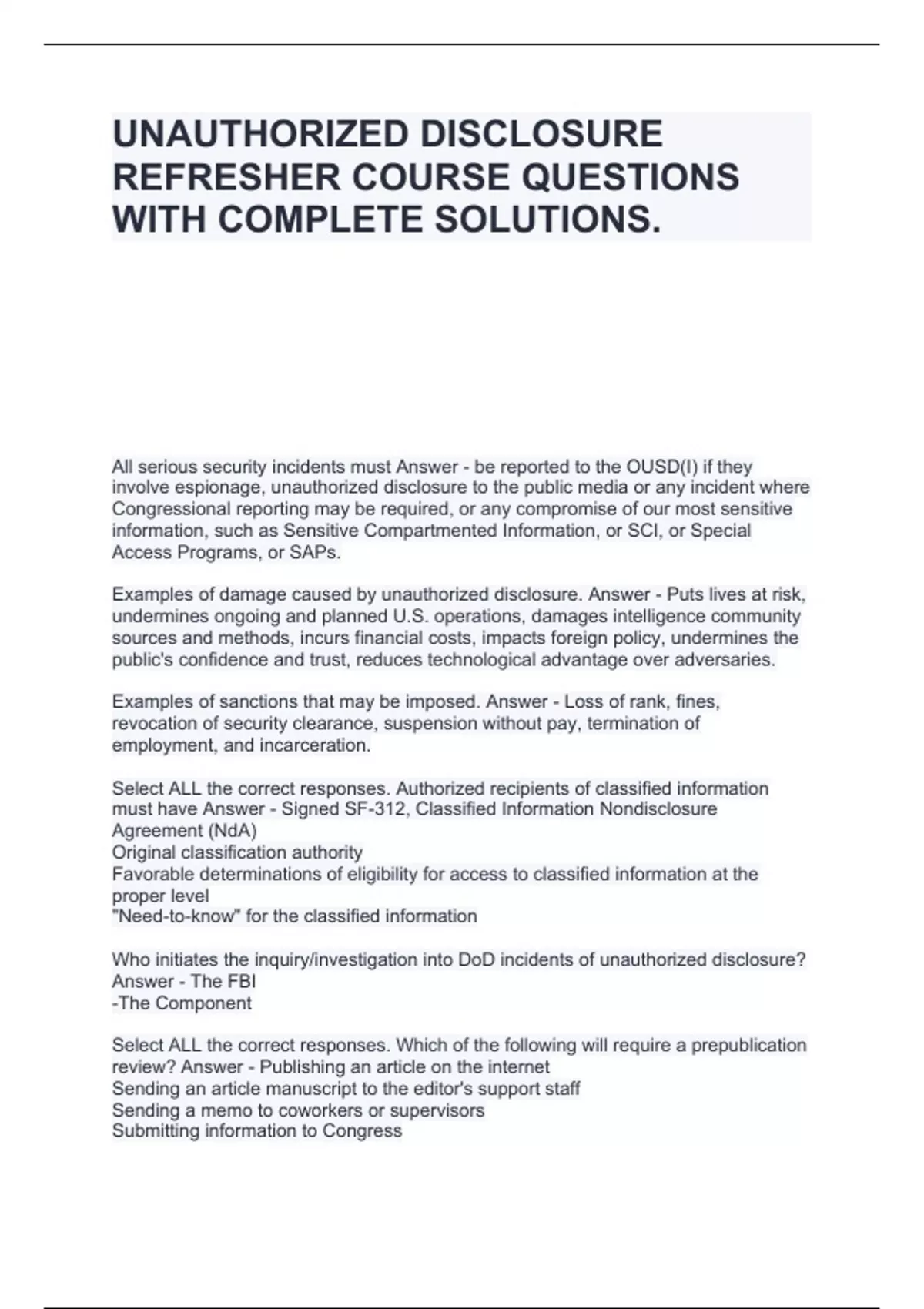 UNAUTHORIZED DISCLOSURE REFRESHER COURSE QUESTIONS WITH COMPLETE SOLUTIONS.