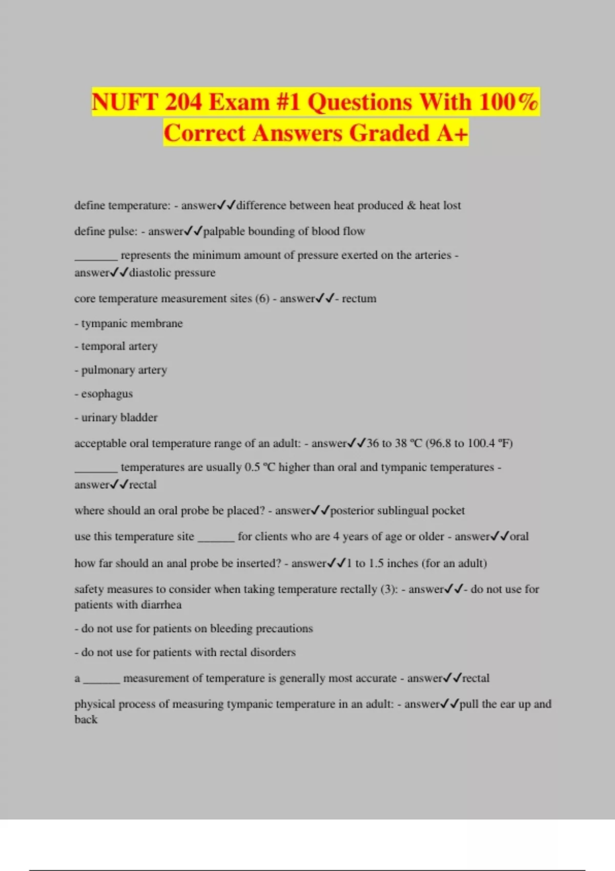 NUFT 204 Exam #1 Questions With 100% Correct Answers Graded A+ define temperature: - answerdifference between heat produced & heat lost define pulse: - answerpalpable bounding of blood flow _______ represents the minimum amount of pressure exerted on the arteries - answerdiastolic pressure core temperature measurement sites (6) - answer- rectum - tympanic membrane - temporal artery - pulmonary artery - esophagus - urinary bladder acceptable oral temperature range of an adult: - answer36 to 38 ºC (96.8 to 100.4 ºF) _______ temperatures are usually 0.5 ºC higher than oral and tympanic temperatures - answerrectal where should an oral probe be placed? - answerposterior sublingual pocket use this temperature site ______ for clients who are 4 years of age or older - answeroral how far should an anal probe be inserted? - answer1 to 1.5 inches (for an adult) safety measures to consider when taking temperature rectally (3): - answer- do not use for patients with diarrhea - do not use for patients on bleeding precautions - do not use for patients with rectal disorders a ______ measurement of temperature is generally most accurate - answerrectal physical process of measuring tympanic temperature in an adult: - answerpull the ear up and back physical process of measuring tympanic temperature in a child younger than 3: - answerpull the ear down and back fever is usually not harmful unless it exceeds ______ - answer102.2 ºF (39 ºC) how would you manage fever in adults? - answerprovide antipyretics (aspirin, acetaminophen, ibuprofen) how should fever NOT be managed in children and adolescents with viral illness? why? - answerdo not give aspirin; risk of Reye syndrome hypothermia is a body temperature less than________ - answer35ºC (95.2 ºF) define pulse deficit: - answerdifference between the apical and radial pulse rates what is the procedure for irregular pulsation? - answercount for a full minute and compare the result to the apical pulse rate when would you use the apical pulse site (4)? - answerwhen assessing: - infants - rapid rates (faster than 100/min) - irregular rhythms - prior to the administration of cardiac medications proper stethoscope placement: - answerfifth intercostal space at the left midclavicular line accurate assessment of respiration involves observing 3 things: - answer- rate - depth - rhythm respiration: the expected reference range for adults (per ATI) - answer12 to 20 breaths/min pulse oximetry: the expected reference range - answer95% to 100% respiration: the expected reference range for adolescents (per ATI) - answer20 to 30 breaths/min (general) procedure for measuring respiratory rate: - answer- *observe one full respiratory cycle* - if regular, count for 30 seconds & multiply by 2; if irregular, count for 1 min BP: when should a patient return for two or more visits? - answerif they have a SBP greater than 140 mm Hg & a DBP greater than 90 mm Hg (that are averages of two or more BP measurements) define pulse pressure: - answerthe difference between systolic & diastolic pressure readings auscultatory method: the width of the cuff should be _____ of the arm circumference at the point where the cuff is wrapped - answer40% auscultatory method: the bladder should surround ____ of the arm circumference of an adult and the whole arm for a child - answer80% auscultatory method: readings on a cuff that is too large - answerfalsely low auscultatory method: readings on a cuff that is too tight - answerfalsely high correct positioning for observing respiratory rate: - answer- semi-Fowler's position - rest an arm across abdomen if a patient has an _________, it's likely they will also have an elevated pulse rate - answerelevated temperature S2 is produced when: - answerthe sem
